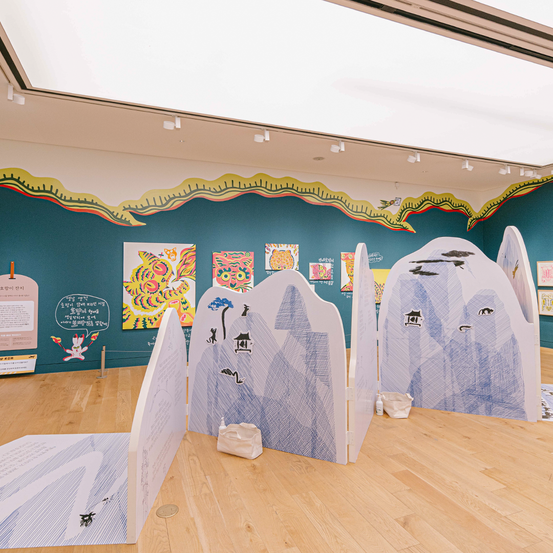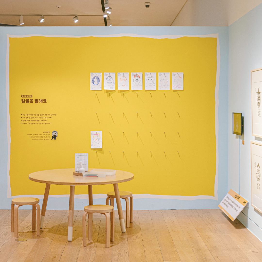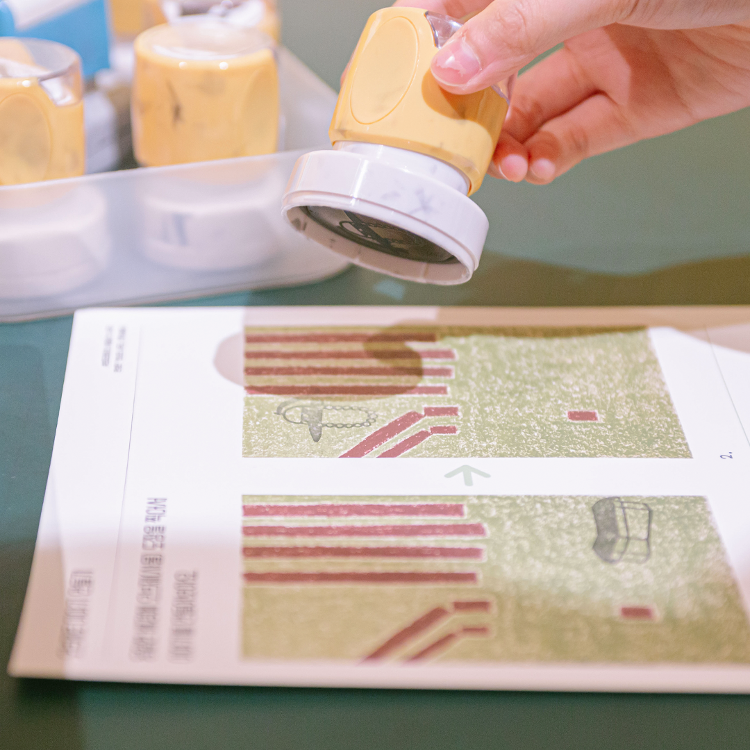 현대어린이책미술관의 <#보따리바캉스> 전시가 더욱 특별한 이유는 전시를 감상할 뿐만 아니라 작품 속에 들어가 여러 가지 체험을 직접 경험해볼 수 있다는 점인데요. 여기 오브제 스탬프를 사용해서 나만의 『종이 오린 전래』를 만들어봅시다. 어떤 이야기가 펼쳐질지 마음껏 상상해봐요. 작품마다 연계된 활동이 있으니 전시를 감상한 후엔 그림도 그리고 글도 쓰며 시간 가는 줄 모르겠네요!