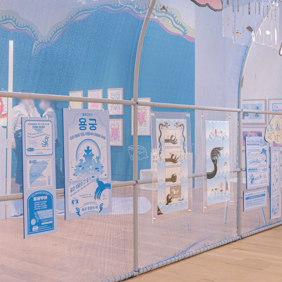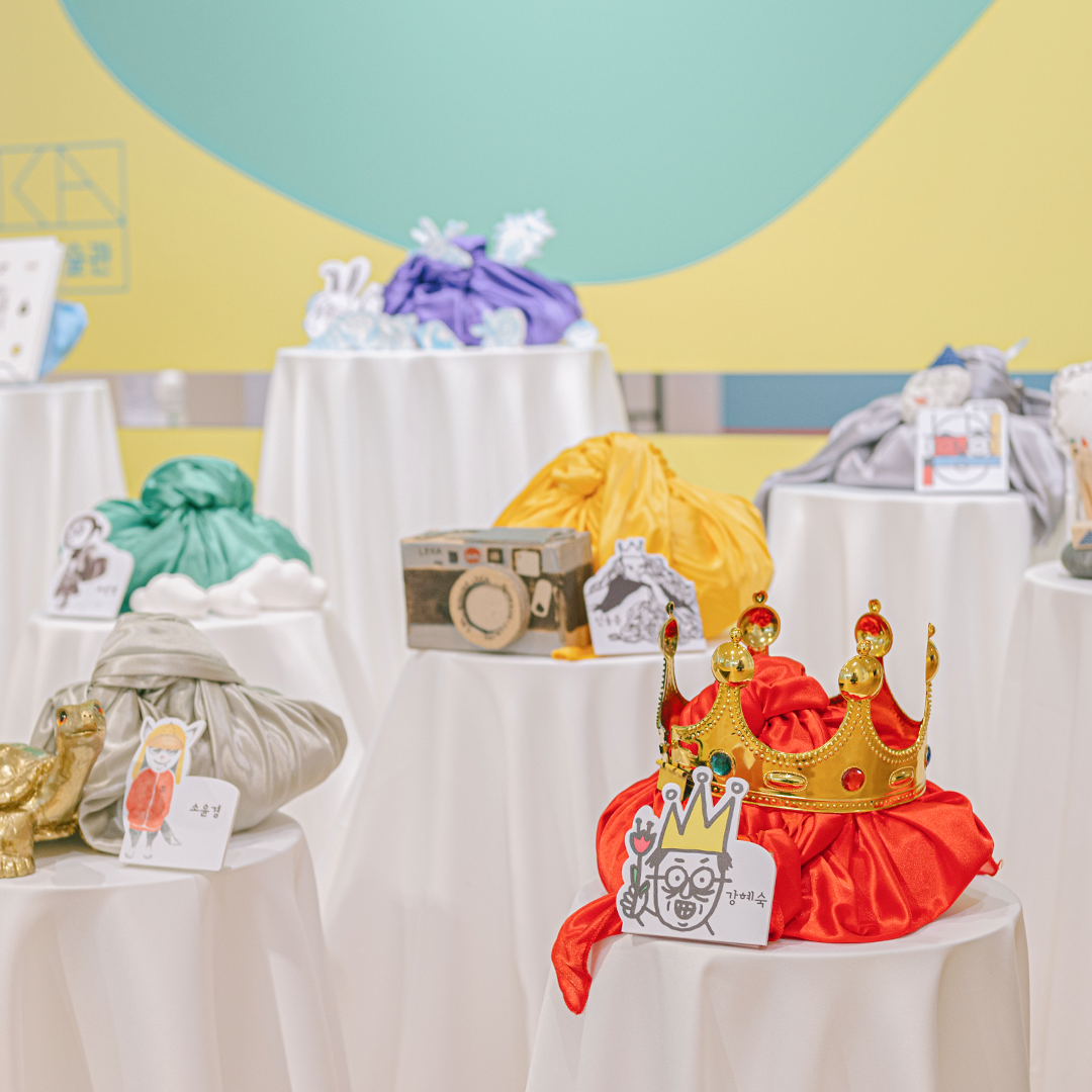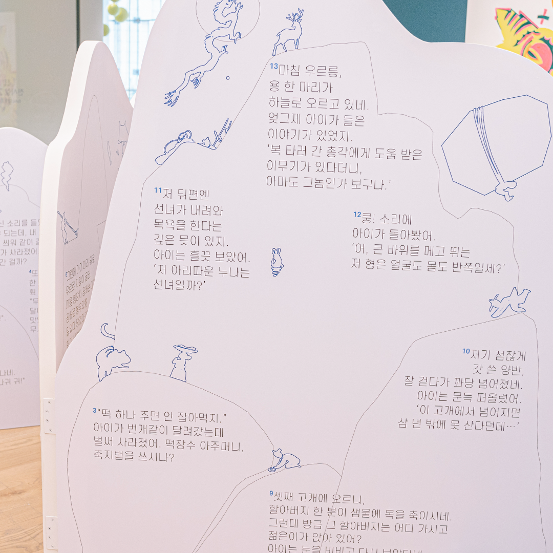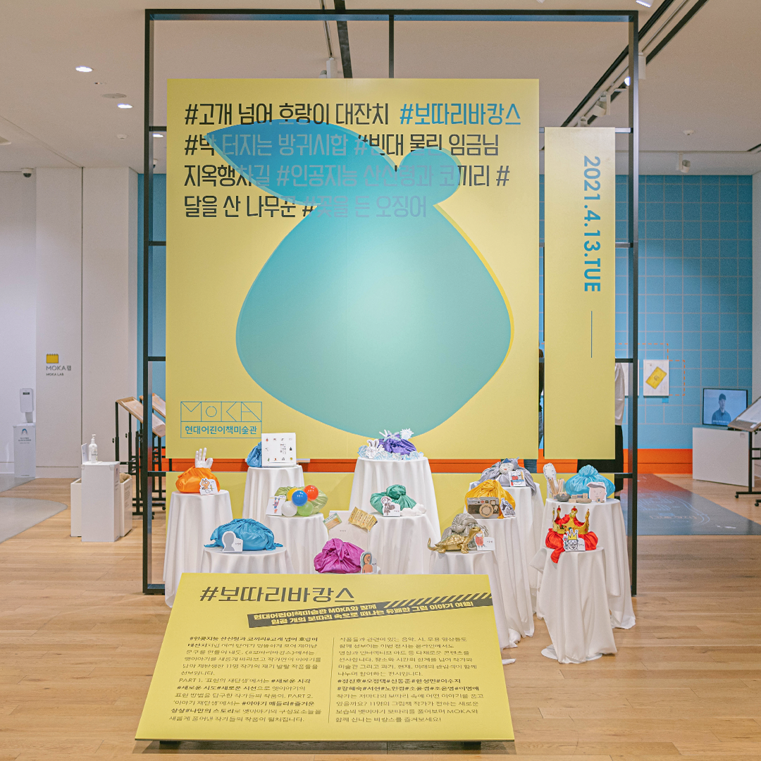 5층 ‘PART 1. 표현의 재탄생’에서는 옛이야기를 새로운 시각, 새로운 시도, 또는 새로운 시선으로 다시 바라보았어요. 그리고 6층 ‘PART 2. 이야기 재탄생’에서는 이야기를 이어 보거나 즐거운 상상을 더하기도 하고 나만의 스토리로도 엮어보았답니다. MOKA의 <#보따리바캉스> 전시에서는 작가들의 그림책에서 나온 작품들을 감상하는 것에서 더 나아가, 직접 그림책 작가가 되어 참여할 수 있는 코너들과 온라인 인터랙티브 아트까지 다양하게 꾸려져 있습니다. 그럼 모두 11명의 작가가 일곱 개의 보따리로 묶어 놓은 이야기들을 풀러 지금 가볼까요?