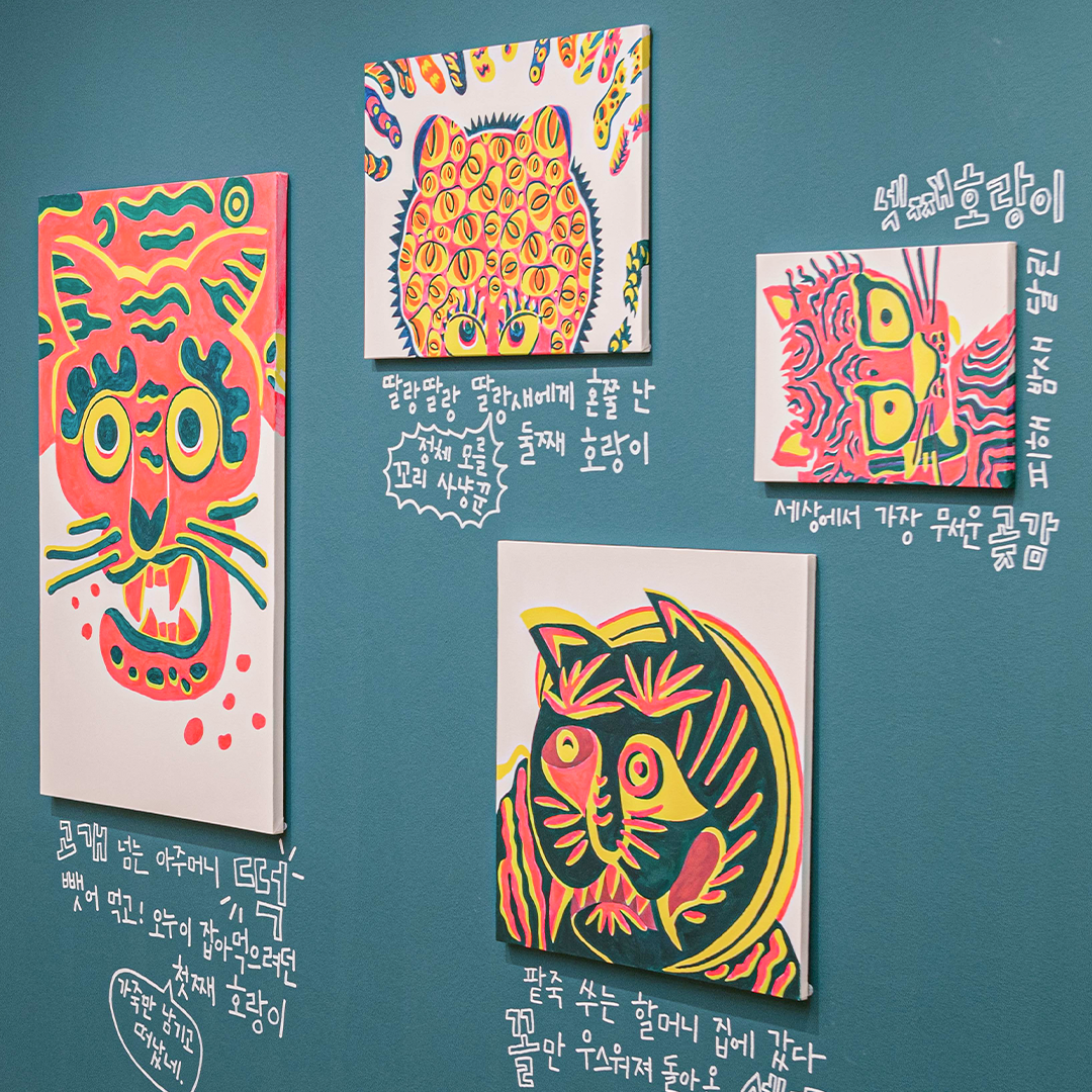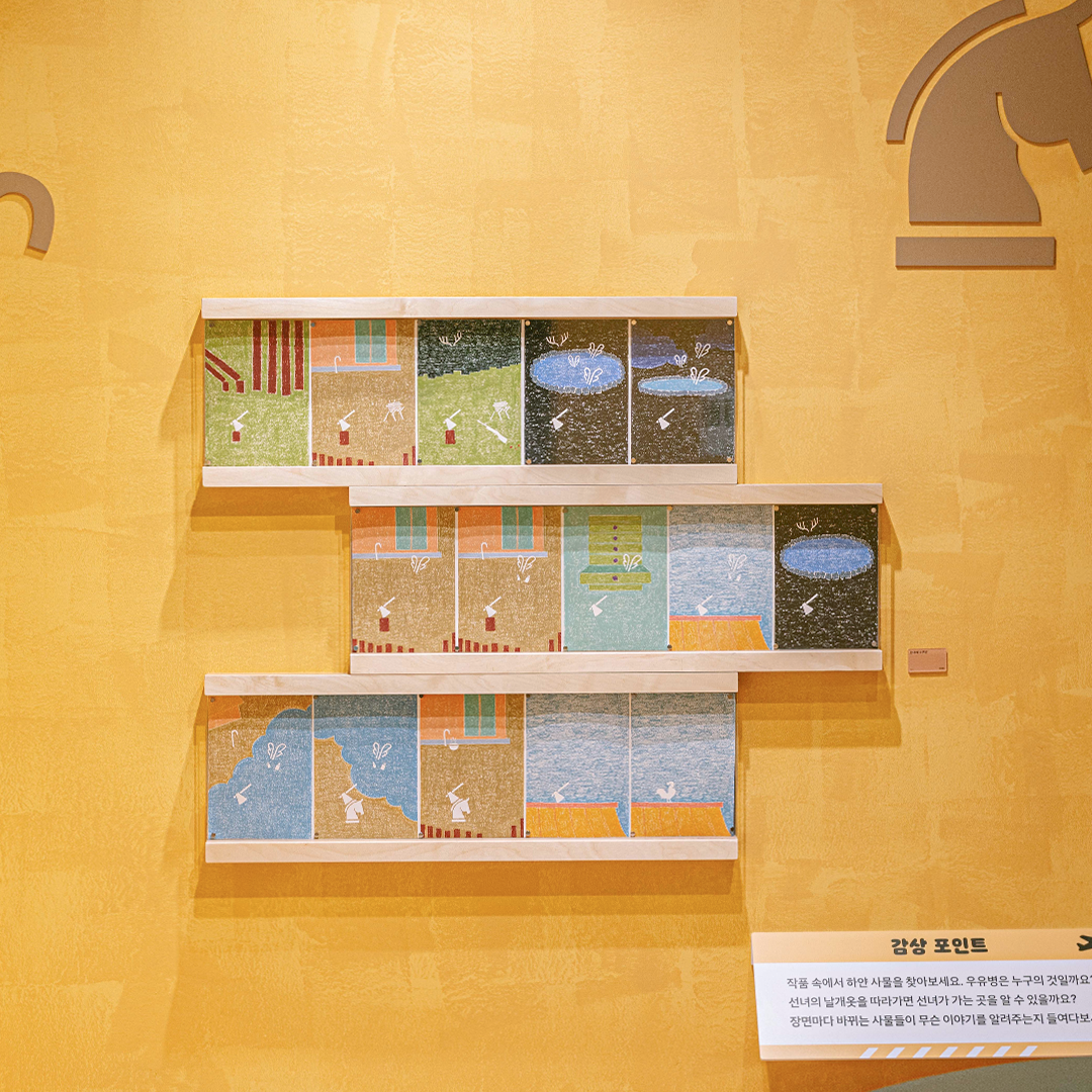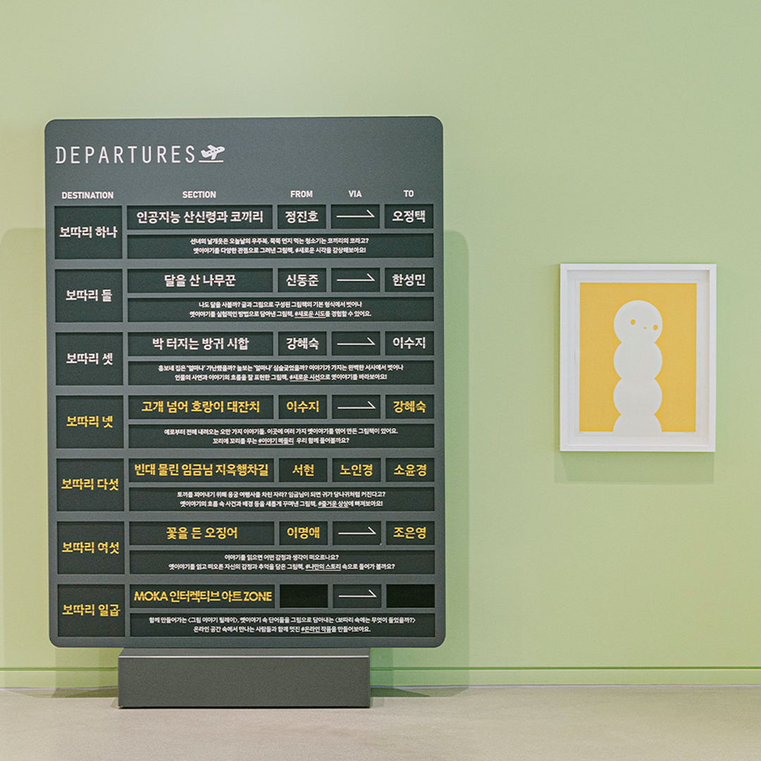 5층 ‘PART 1. 표현의 재탄생’에서는 옛이야기를 새로운 시각, 새로운 시도, 또는 새로운 시선으로 다시 바라보았어요. 그리고 6층 ‘PART 2. 이야기 재탄생’에서는 이야기를 이어 보거나 즐거운 상상을 더하기도 하고 나만의 스토리로도 엮어보았답니다. MOKA의 <#보따리바캉스> 전시에서는 작가들의 그림책에서 나온 작품들을 감상하는 것에서 더 나아가, 직접 그림책 작가가 되어 참여할 수 있는 코너들과 온라인 인터랙티브 아트까지 다양하게 꾸려져 있습니다. 그럼 모두 11명의 작가가 일곱 개의 보따리로 묶어 놓은 이야기들을 풀러 지금 가볼까요?