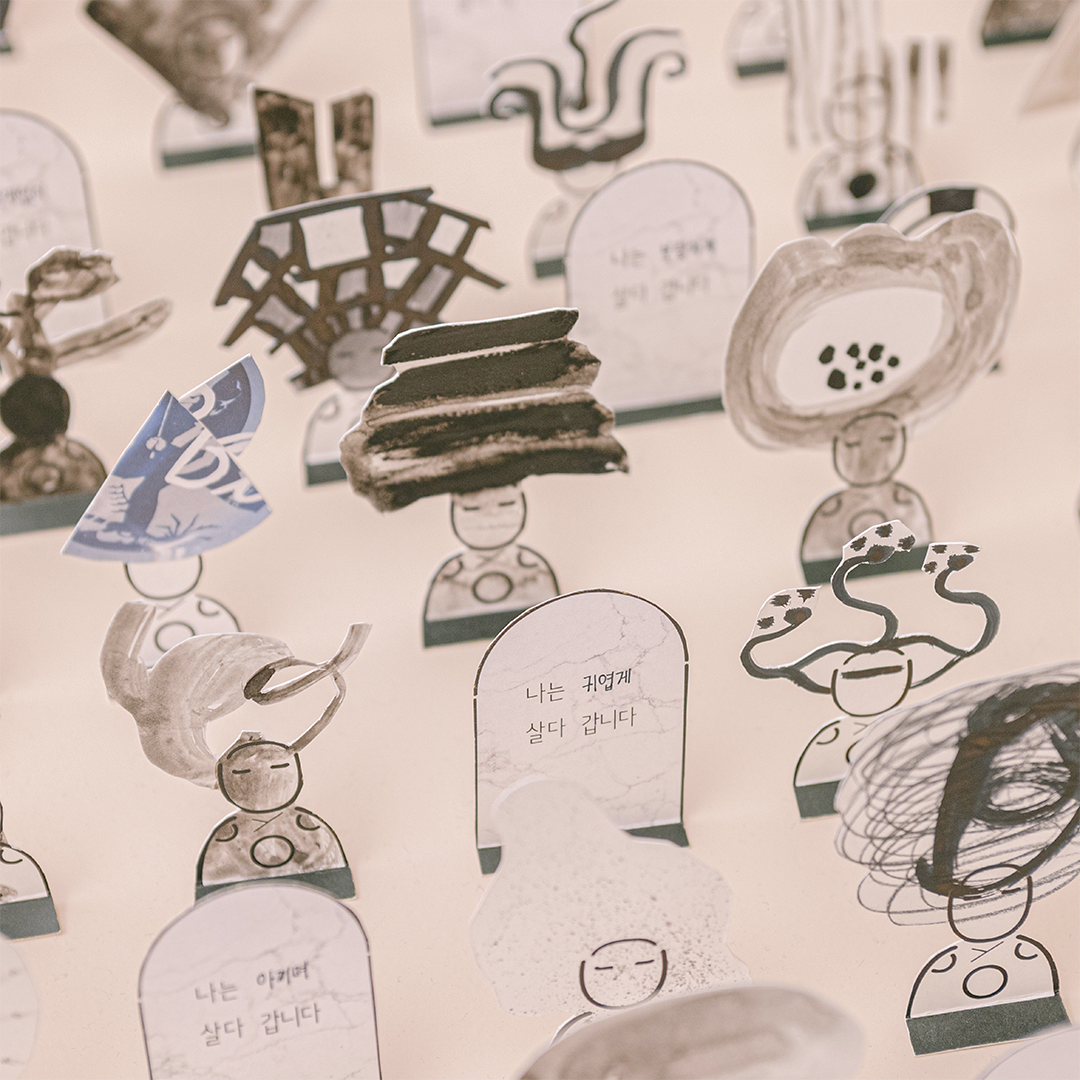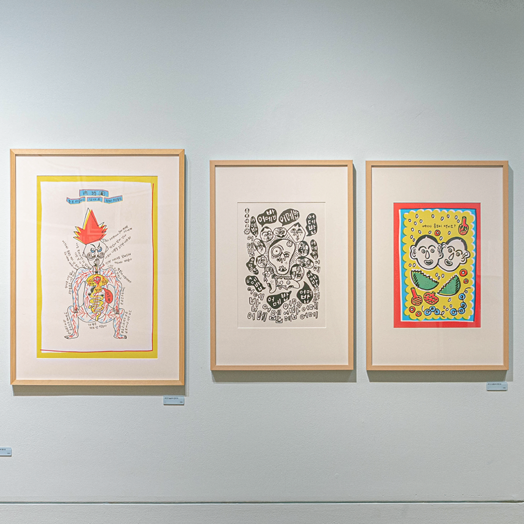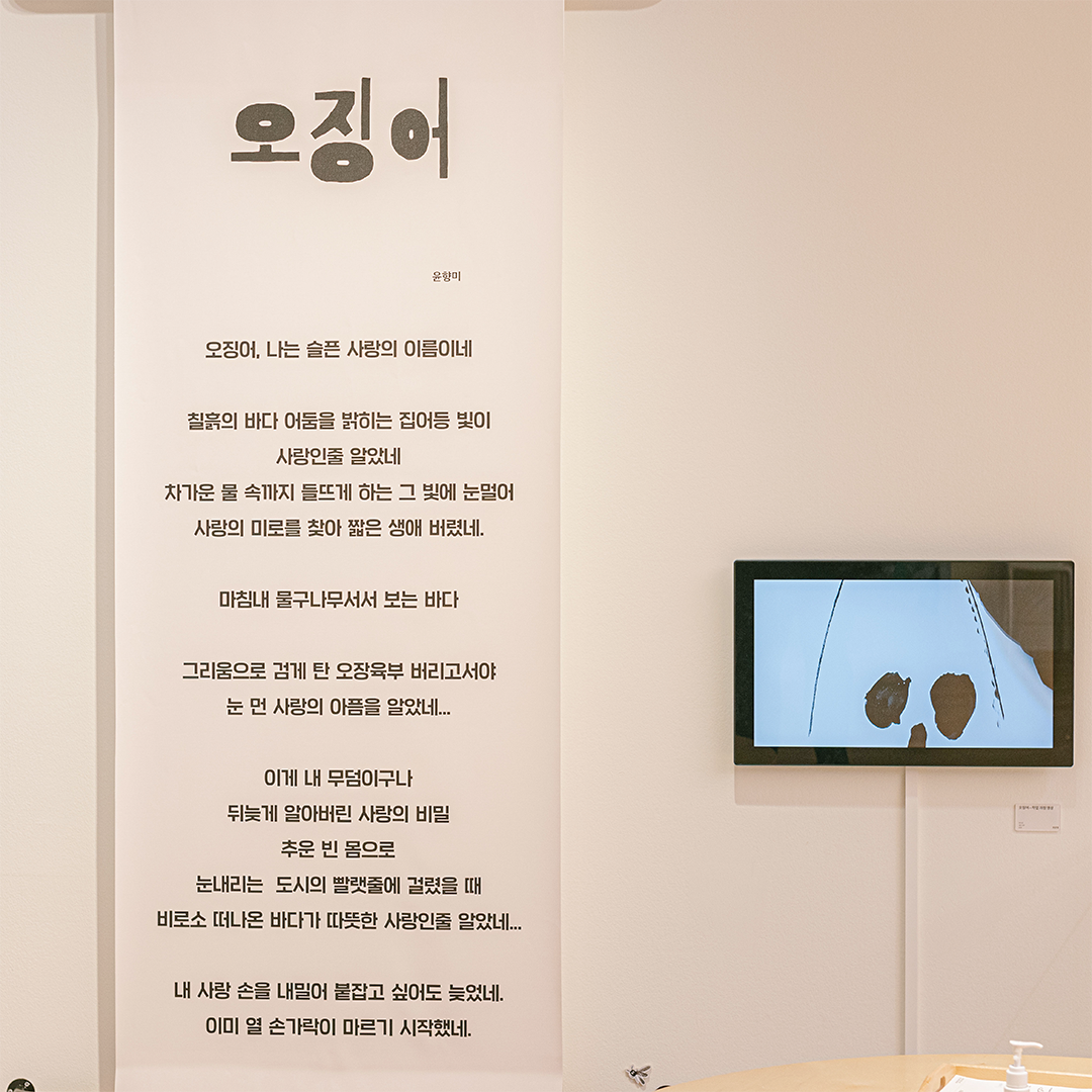 튀김옷이 벗겨져 쏙 빠져나온 오징어가 왠지 날개 잃은 선녀처럼 슬퍼 보이지 않나요? 오징어 먹물로 그린 듯한 조은영 작가의 『오징어』에서 힘없는 오징어, 놀란 오징어, 모범생 오징어 등 다양한 오징어와 그들의 감정을 찾아볼 수 있는데요. 이 작품은 작가가 어린 시절 오징어 튀김을 먹던 기억에서 시작했다고 해요. 한편에 전시된 작가의 어린 시절 추억의 물건들도 함께 보면 그때 그 시절로 나 또한 돌아간 거 같네요.