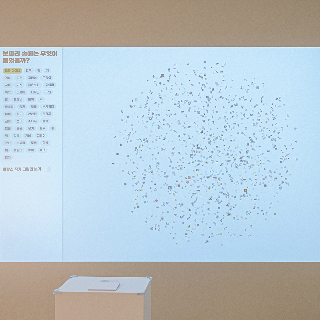 일곱 번째 보따리는 현대어린이책미술관에서는 물론 멀리 온라인에서도 보따리를 채울 수 있는 인터랙티브 아트를 준비했습니다. 먼저 〈보따리 속에는 무엇이 들었을까?〉에서는 다양한 키워드와 주제로 그림을 직접 그려서 보따리에 넣어주세요. 바캉스 작가들의 그림과 함께 다른 관객들이 남긴 그림들도 찾아볼 수 있어요.