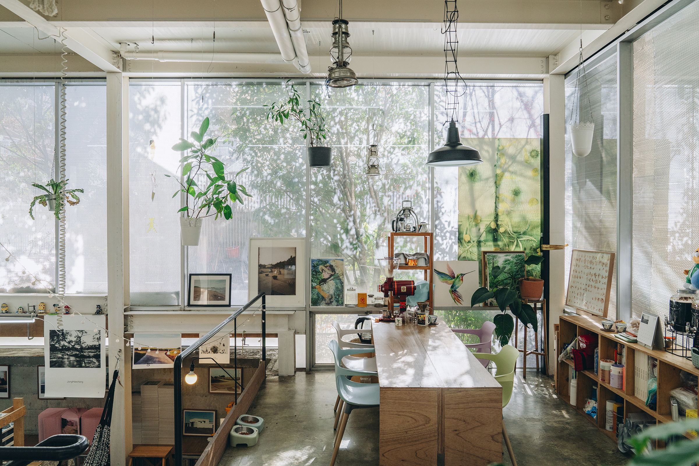 15년 전에 지은 집이에요. 과거 출판사를 운영하던 곳에 임대 문제가 있었던 탓에, 절대 쫓겨나지 않을 공간이 필요하다고 생각했어요. 건축을 하는 친구의 도움을 받아 집을 지었죠. 지하와 1층은 작업실, 2층은 가정집으로 사용 중이에요. 빛이 한가득 들어오는 통창과 집 안 곳곳에 놓인 나무 소재의 가구가 따뜻한 분위기를 풍기죠. 날씨 좋을 땐 야외에서 작업하려고 야외 공간도 만들었어요. 이곳은 우리 가족만의 공간은 아니에요. 이웃도 한 번씩 초대하고, 소소한 공연도 열어요. 작업물을 보고 싶은 분이라면 언제든 찾아올 수 있는 곳이죠.