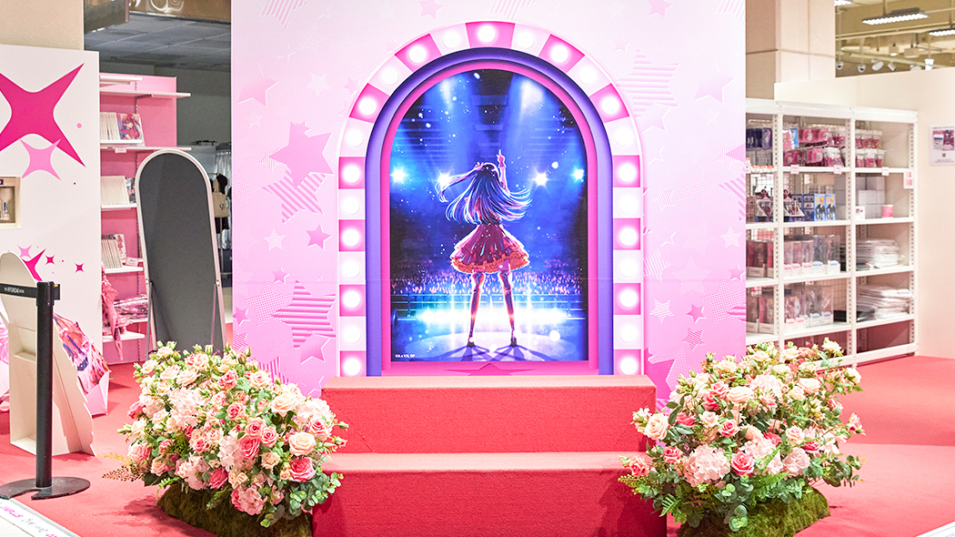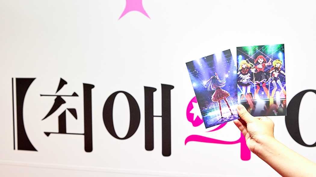 이번 팝업스토어는 하나의 포토존처럼 꾸며졌어요. 공간을 빙 둘러싼 외벽 위로는 화려하게 빛나는 아이돌 시절의 ‘아이’와 쌍둥이 주인공들의 어린 시절, 그리고 현재 모습까지 애니메이션 세계관 속 모든 시간대를 만나볼 수 있습니다. 풍경을 따라가다 보면 레드카펫이 깔린 앙증맞은 계단이 보이는데요. 그 위로 펼쳐지는 건 무대 위 ‘아이’의 모습! 금방이라도 환호성이 들려올 것 같은 풍경 앞에서 기념사진을 찍을 수 있어요.
