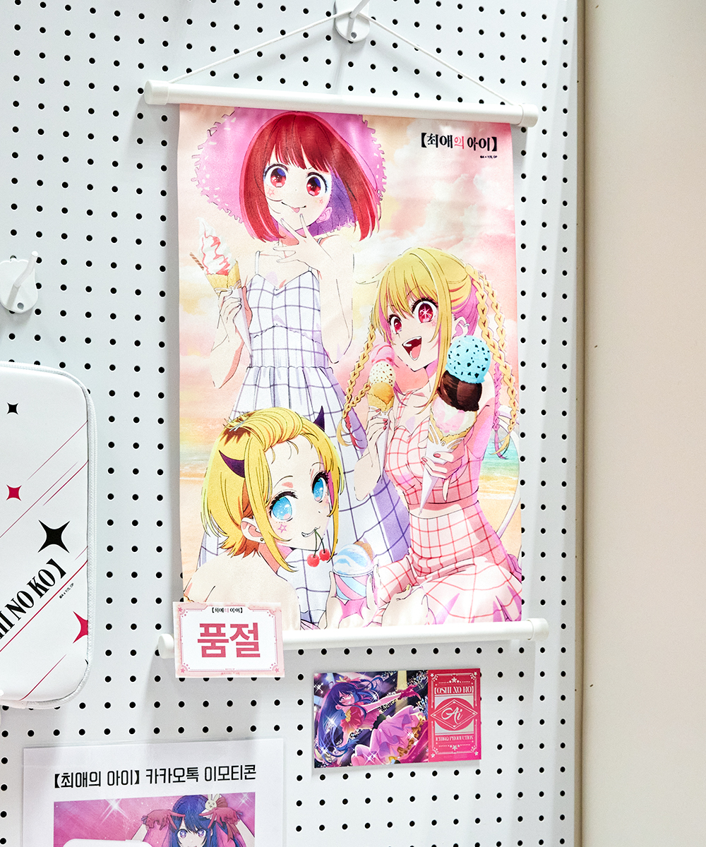 <최애의 아이> 원작 만화책과 함께 원작자가 직접 그린 일러스트집도 만나볼 수 있었는데요. 130여 개 이상의 일러스트와 함께 초기 캐릭터 디자인, 애니메이션 1화 콘티 등 최초 공개되는 내용들이 다수 수록되었어요. 첫 번째 정식 한국어판으로 팬이라면 절대 놓치고 싶지 않을 굿즈였습니다.