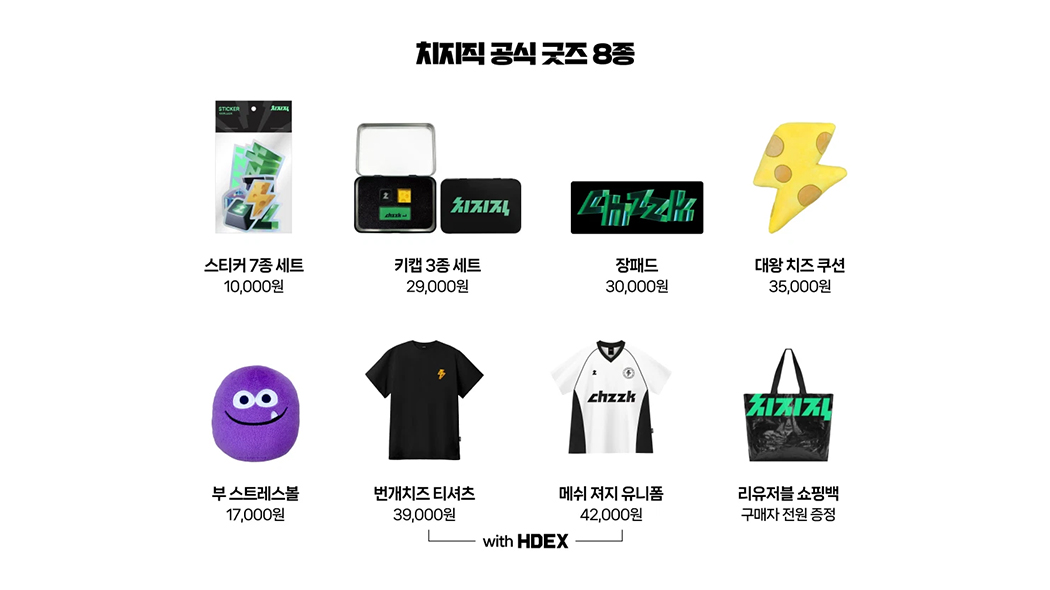 스트리머 드로잉 밀크컵, 마우스패드, 멀티 클리너 등의 스트리머 굿즈 상품을 비롯해 덕후들의 마음을 사로잡을 쇼핑백, 쿠션, 키캡 3종 세트, HDEX 콜라보 유니폼 등을 한정 판매합니다.