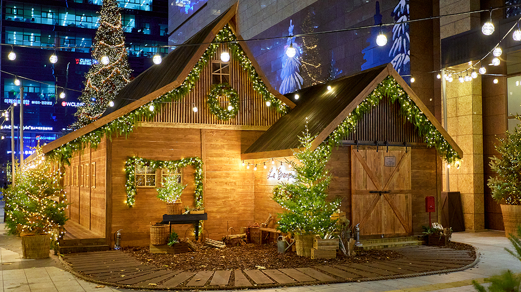 ‘곡물창고’ 컨셉에 맞게 무역센터점 1층 출입구에 거대한 ‘그랑지’가 등장했어요. 이름에 걸맞게 목가적이며 이국적인 느낌을 자아냅니다. 화려한 대형 크리스마스트리들로 둘러싸인 해리와 할아버지의 곡물 창고를 표현한 이 대규모 공간 안에서는 깊은 숲 속에 자리한, 따뜻한 오두막의 분위기를 그대로 느낄 수 있는데요.