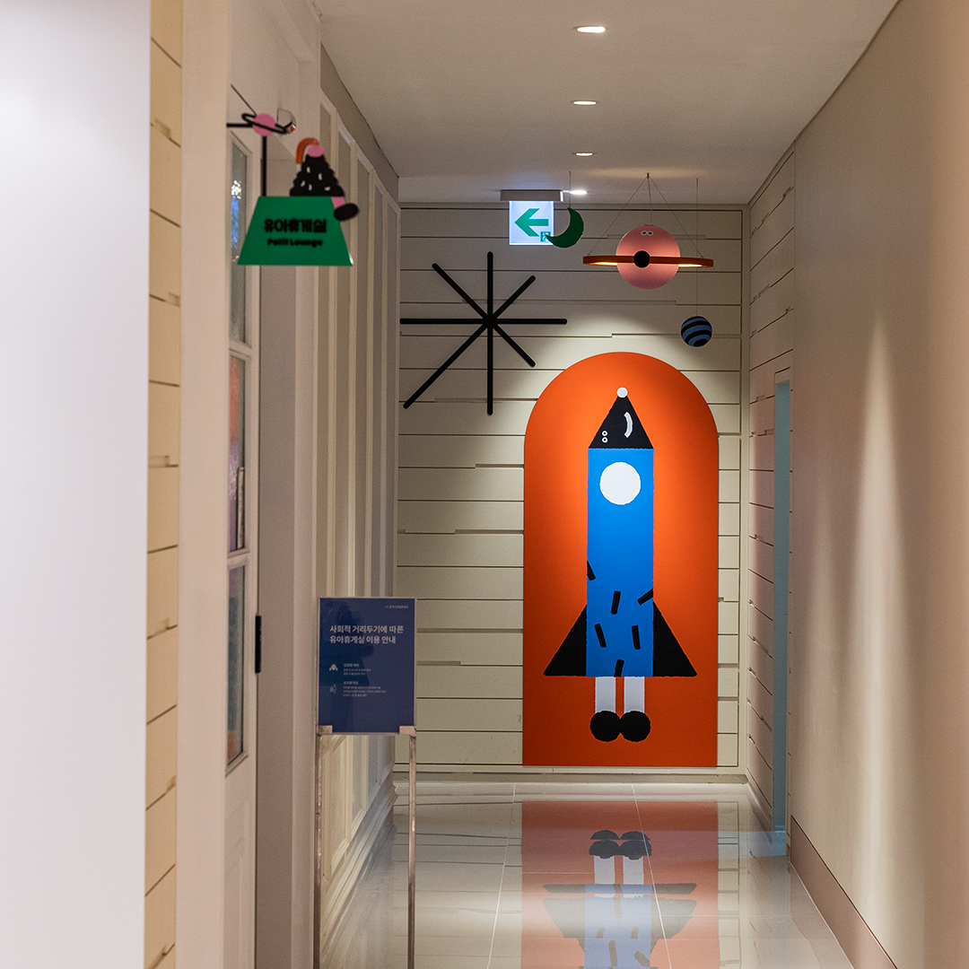 플레이그라운드뿐만 아니라 쁘띠플래닛 곳곳에서 다양한 도형을 결합하여 만든 독특한 형태와 높은 층고를 잘 활용한 공간 디자인을 찾아볼 수 있는데요. 다이내믹한 공간 안에 아이들의 호기심을 자극하고 오래오래 관찰할 수 있도록 재미있는 아이디어들도 가득하답니다.