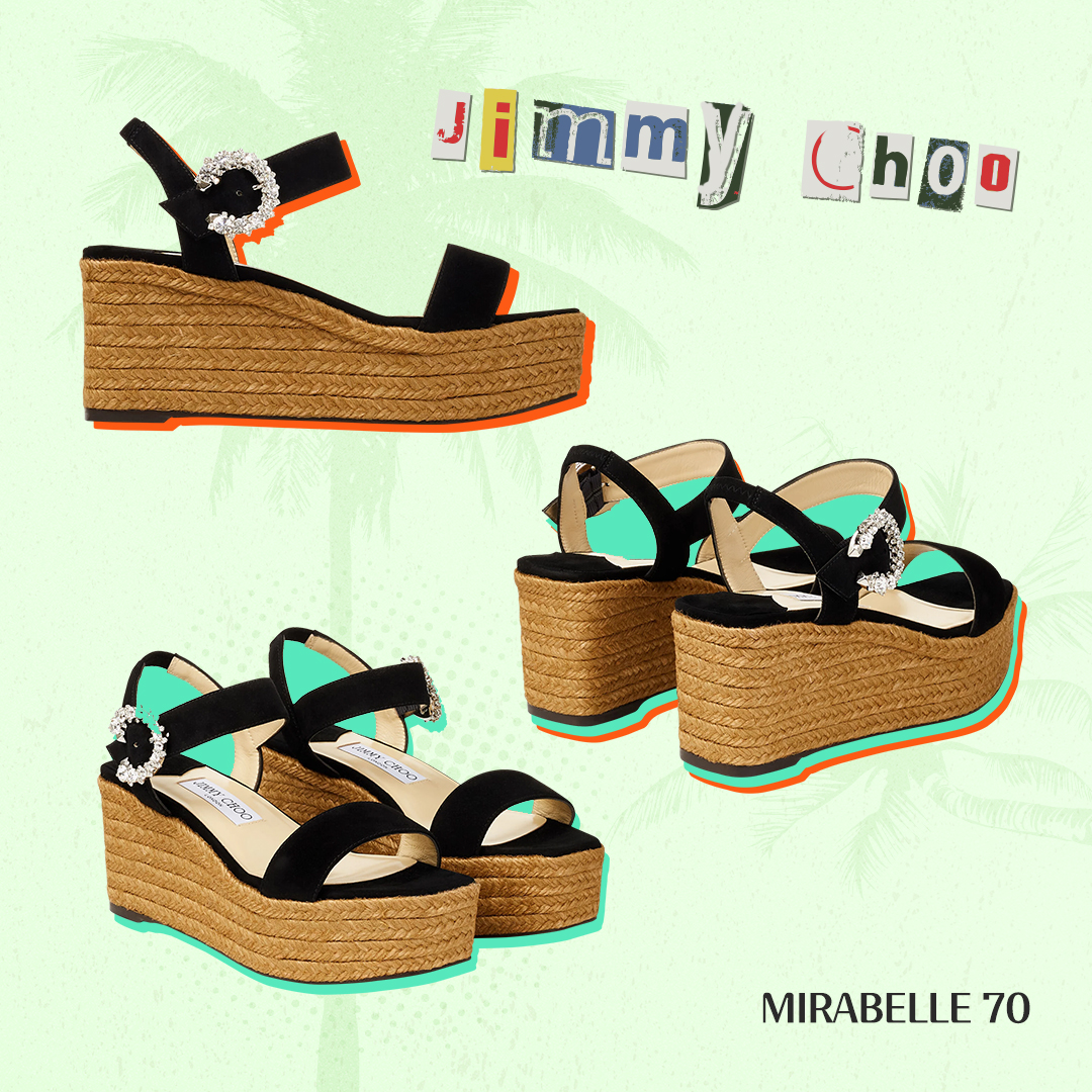 브레이디드 로프 웨지 위에 지미추의 돋보이는 스타일링을 조합해 완성된 샌들입니다. 블랙 스웨이드 소재에 더해진 크리스털 장식의 버클 하드웨어 잠금이 럭셔리한 매력을 전하는데요. 안정감은 물론 화려함도 맘껏 즐길 수 있습니다. 움직임에 따라 변하는 반짝거림이 스타일링을 한 층 더 빛나게 완성시켜줄 거예요. 제품 바로가기