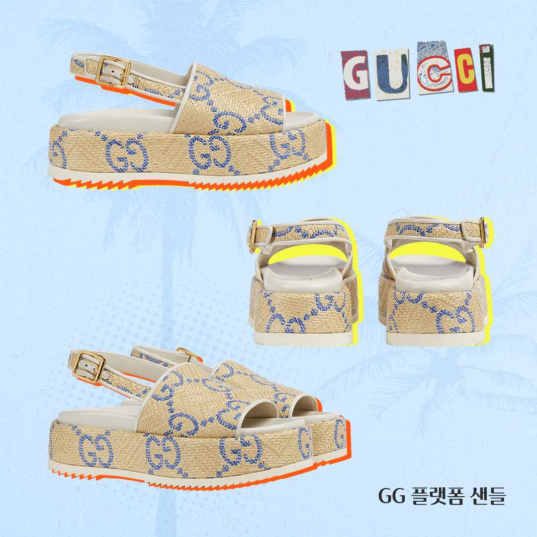 70년대와 60년대에서 영감을 받은 에스파드류 플랫폼 샌들입니다. 구찌 러브 퍼레이드 컬렉션 전반에서 확인할 수 있는 실루엣과 함께 빈티지한 느낌의 스타일을 완성하고 있는데요. 라피아 느낌의 베이지/라이트 블루 GG 소재로 더 짙은 레트로 감성을 드러냈습니다. 발목엔 조절 가능한 버클 클로저가 더해져 착용감을 더했죠.