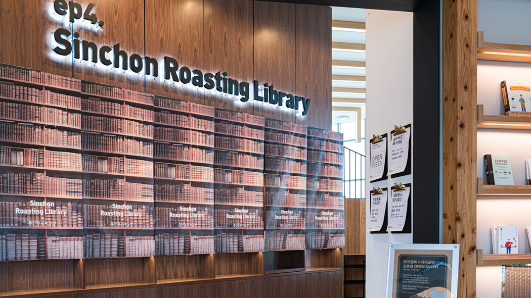 신촌점 아크앤북 바로 옆 매장은 ‘신촌 로스팅 라이브러리’입니다. 로스터리 카페 통인동 커피공방에서 운영하는 카페로, 통유리창 너머로 내다보이는 신촌역과 홍대 인근 뷰가 멋진 곳이죠. 여기서 테이크아웃한 커피는 아크앤북으로 가져가 책을 읽으며 마실 수 있다는 거!