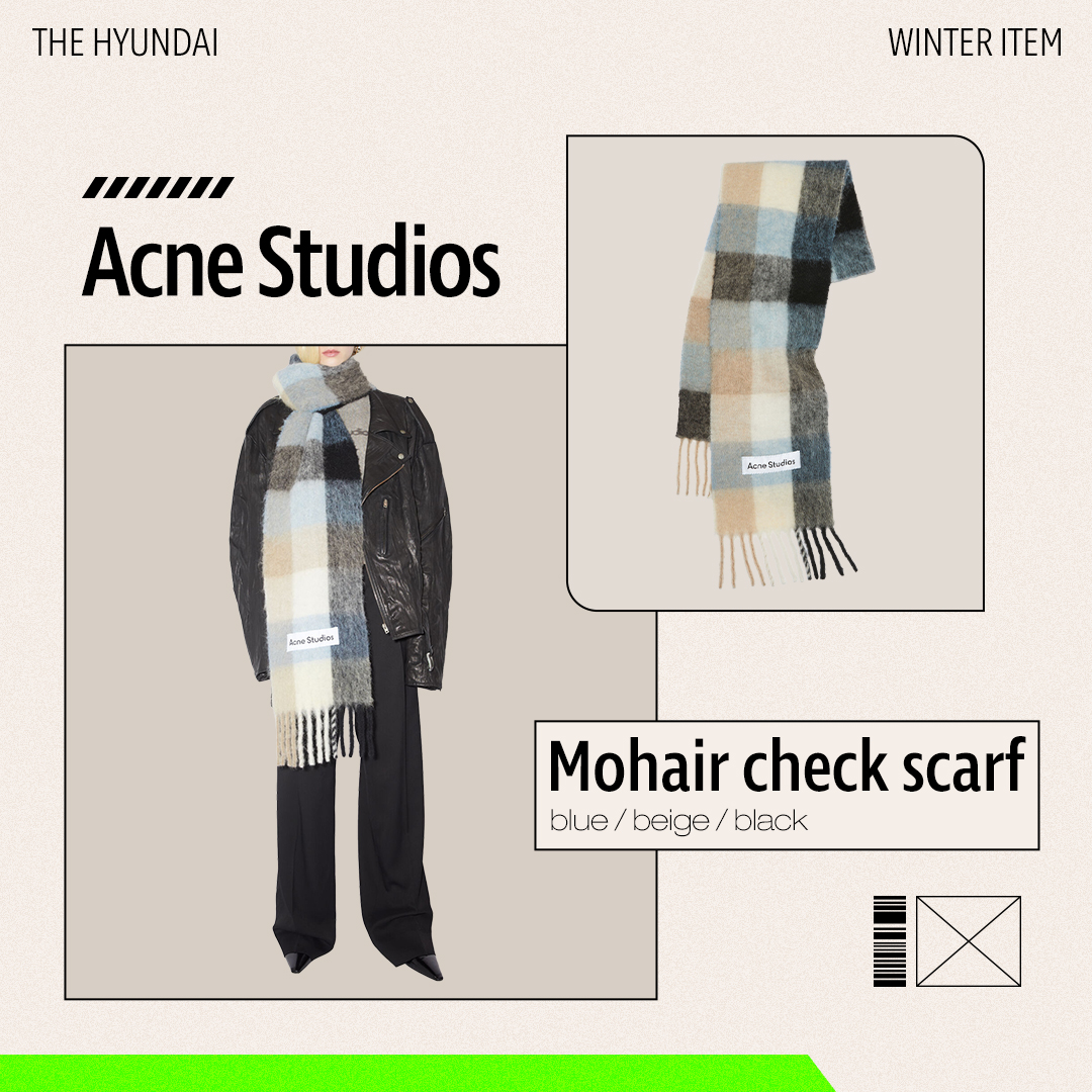 매년 겨울 많은 이들이 찾는 아크네 스튜디오의 체크 스카프를 활용해 보세요. 모헤어 혼방 소재로 만들어진 이 스카프는 부드럽고 풍성한 질감으로, 두르는 순간 포근한 느낌을 연출할 수 있습니다. ‘Acne Studios’ 자수 로고와 프린지 디테일이 포인트가 되어주며, 체크 패턴을 이루는 색상 조합 또한 다양한 룩에 매치하기 좋습니다.