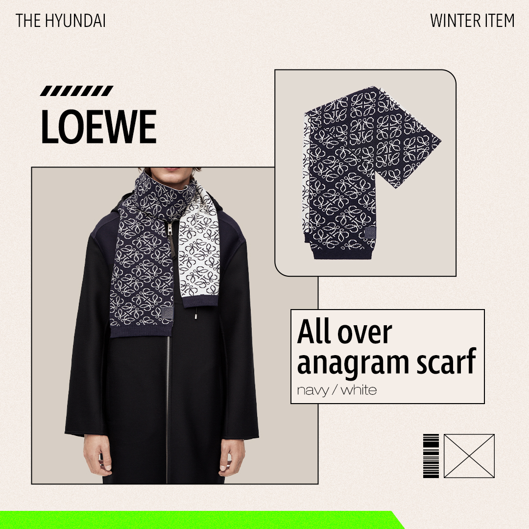 단색이나 체크 패턴의 베이식한 아이템을 이미 가지고 있다면, 올겨울에는 색다른 디자인의 스카프를 시도해 보는 건 어떨까요? 올 니트 소재의 로에베 스카프는 배경 전체에 애너그램 패턴이 새겨져 있지만, 네이비와 화이트의 실패 없는 컬러 조합으로 부담스럽지 않게 착용할 수 있습니다. 유니크한 듯하면서도 가장자리의 마감 포인트에서 느껴지는 단정한 무드는 어떤 아이템과 매치하는지에 따라 다양한 분위기를 연출해 줄 거예요.