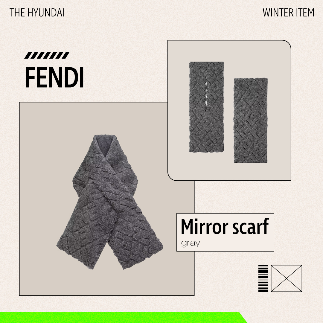 롱한 길이감의 스카프가 번거롭게 느껴진다면 펜디의 패딩 스카프를 추천합니다. 부드러운 다크 그레이 컬러의 울 패브릭 겉감에 니트 라이닝이 함께 하는 아이템인데요. 펜디의 시그니처 미러 로고가 전체에 새겨져 있으며, 틈새를 통과시켜 착용할 수 있다는 간편함이 돋보이네요.