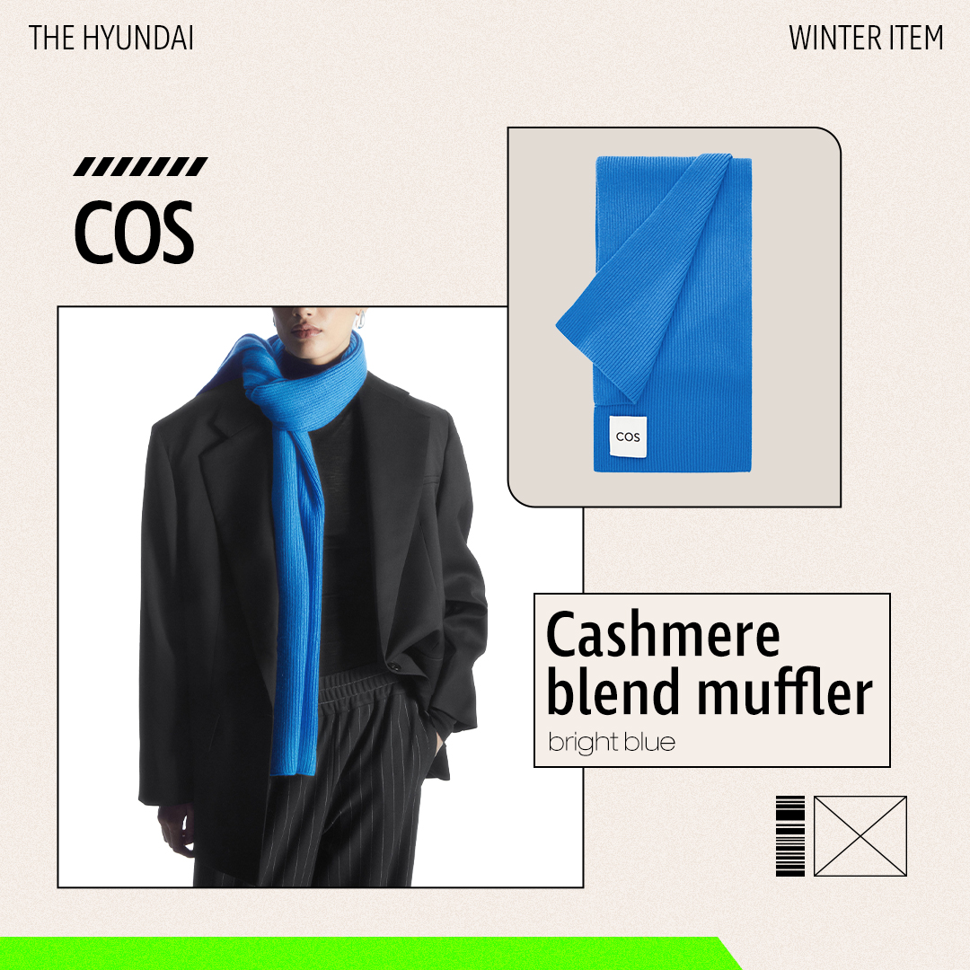 부드러운 질감의 울과 캐시미어 소재가 블렌딩 된 머플러입니다. 단색의 심플한 디자인에 COS 로고가 들어가 있어 평소 미니멀한 룩을 즐긴다면 좋은 선택지가 되겠네요. 청량한 블루 컬러로 겨울철 모노톤 룩에 매치하면 포인트 아이템으로 멋스러운 스타일링을 완성할 수 있습니다.