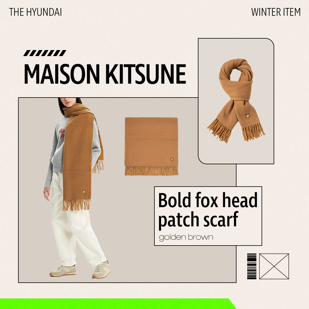 울 소재로 추운 겨울을 따뜻하게 보내게 해줄 메종 키츠네의 스카프도 눈여겨보세요. 베이식한 솔리드 컬러이지만, 폭스 패치 자수가 적절한 포인트가 되어줍니다. 면적이 넓어서 숄처럼 크게 두르거나 반을 접은 상태로 목에 감는 등 다양한 스타일링을 하기 유용한 스카프예요.