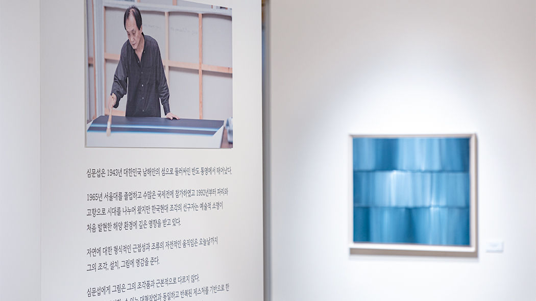 심문섭 작가의 대표작 '더 프레젠테이션The Presentation' 회화 시리즈에는 연속적인 붓질을 통해 사라지거나 덮이는 과정이 투영되어 있고 새로운 것이 드러나는 파도의 운동성과 에너지가 담겨있습니다.