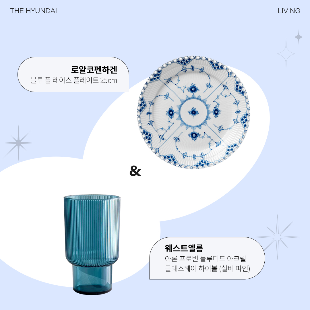 식탁 위에 놓인 블루 패턴의 접시는 보는 것만으로도 시원한 느낌을 자아내는데요. 로얄코펜하겐의 전통적인 블루 패턴은 오랜 시간 사랑받아 온 디자인으로 여름날의 청량한 푸른색을 그대로 담고 있습니다. 간단한 간식을 서빙하거나 앞접시로 사용하기 딱 좋은 로얄코펜하겐의 블루 풀 레이스 플레이트로 식탁에 푸르름을 더해보세요. 플레이트 제품 바로가기