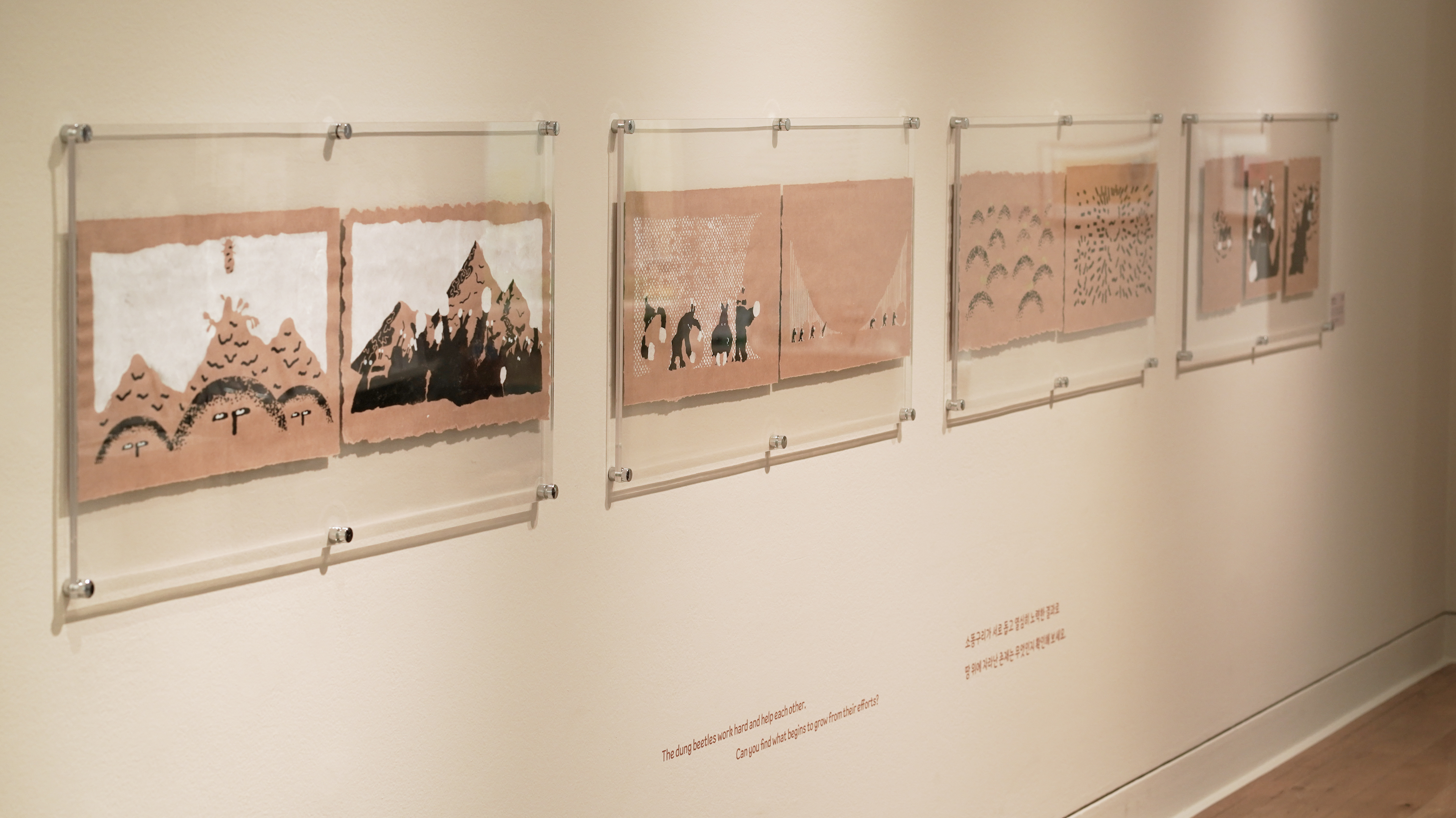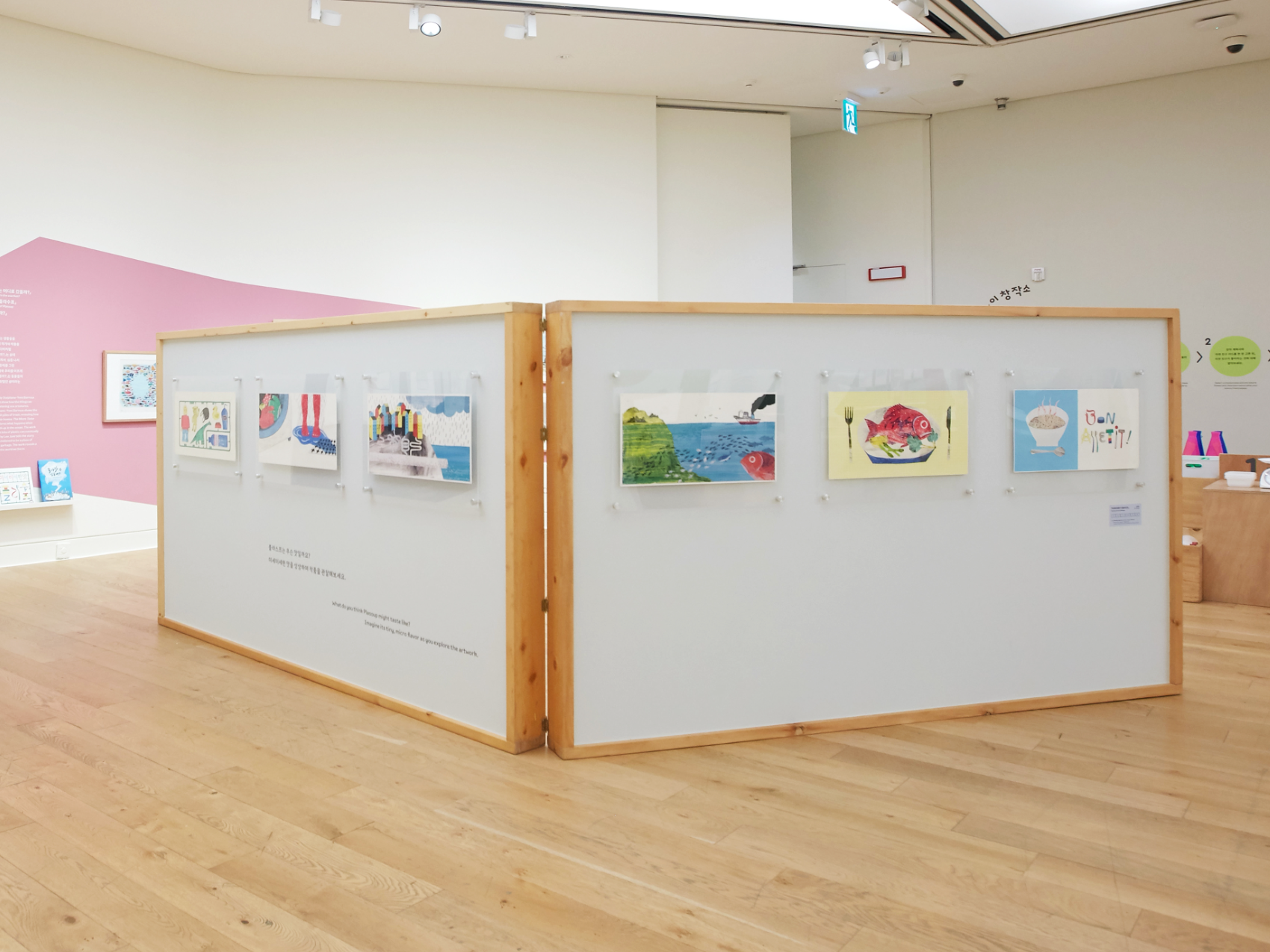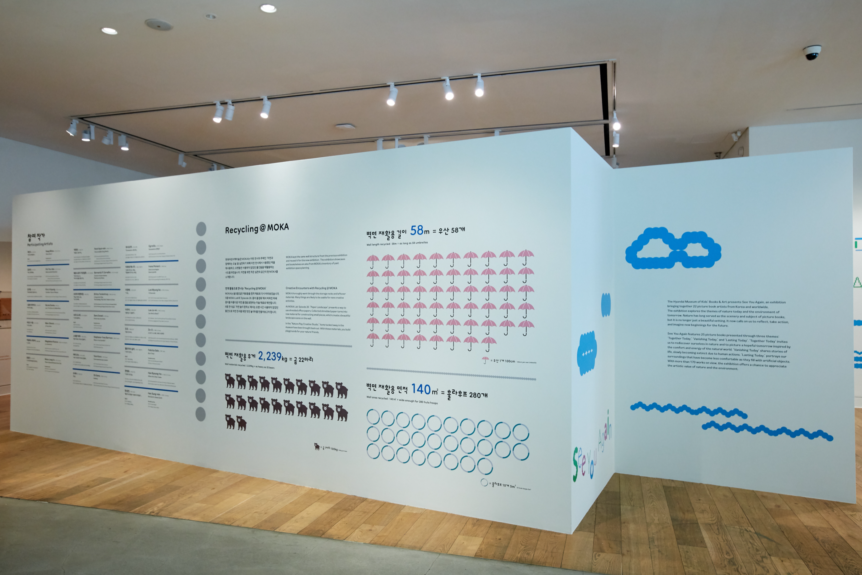 현대어린이책미술관은 이번 전시를 단순한 감상의 장을 넘어, 환경 창작자로서 직접 참여하고 실천할 수 있는 공간으로 확장합니다. 이전에 사용했던 벽체와 창고에 잠들어 있던 도구들을 다시 꺼내어 새롭게 재탄생시켰습니다. 재활용된 벽면에는 어린이의 눈높이에 맞춰 쉽고 흥미로운 내용이 담겨 있는데요. 벽면 재활용의 무게와 길이, 면적 등 다소 어려울 수 있는 개념을 곰, 우산, 훌라후프처럼 친숙한 존재를 통해 직관적으로 이해할 수 있도록 구성했습니다.
