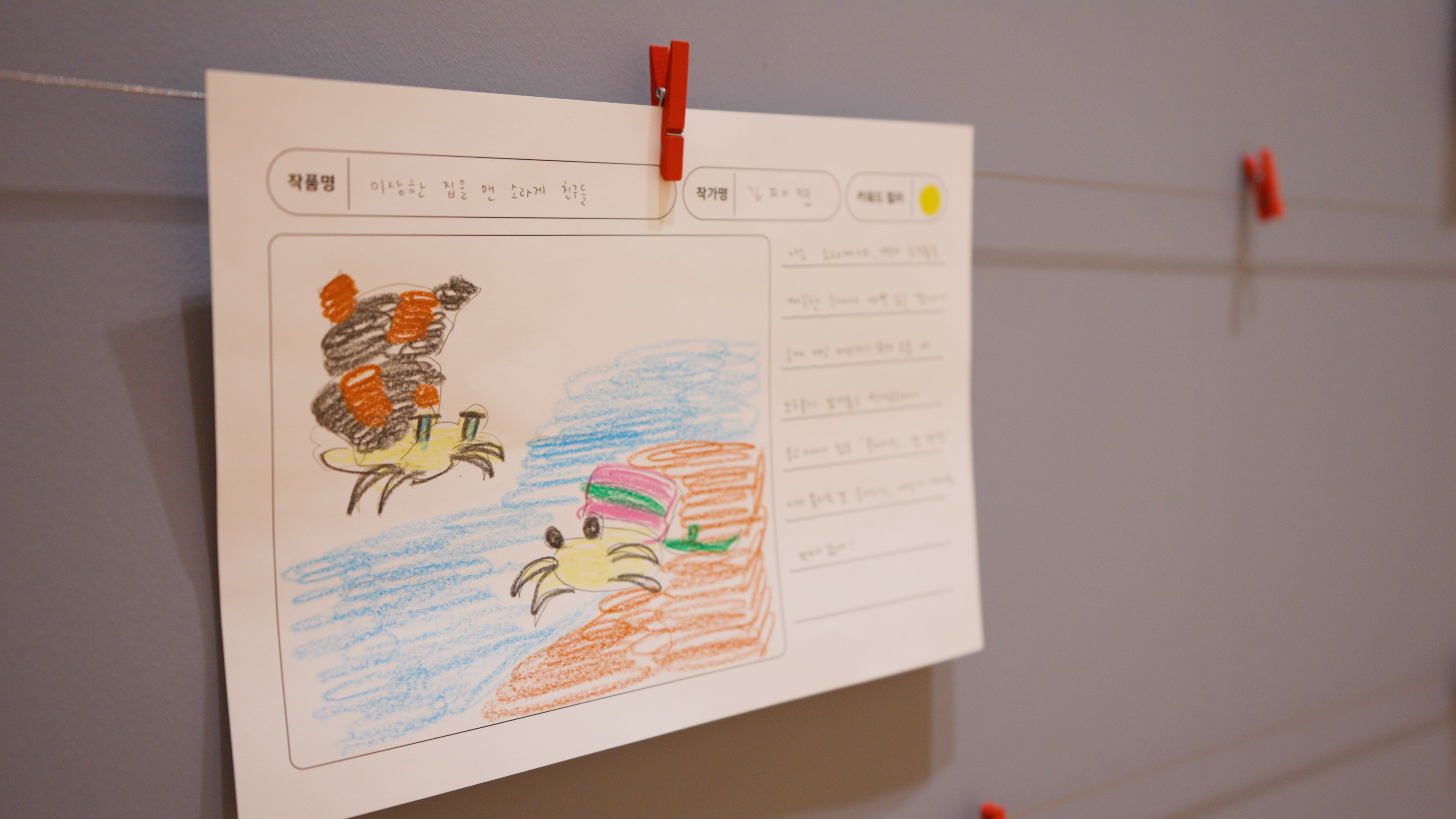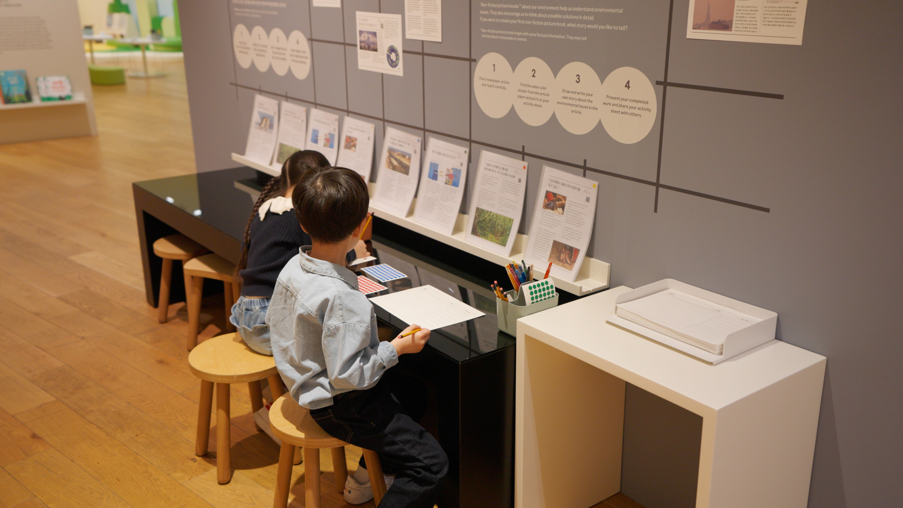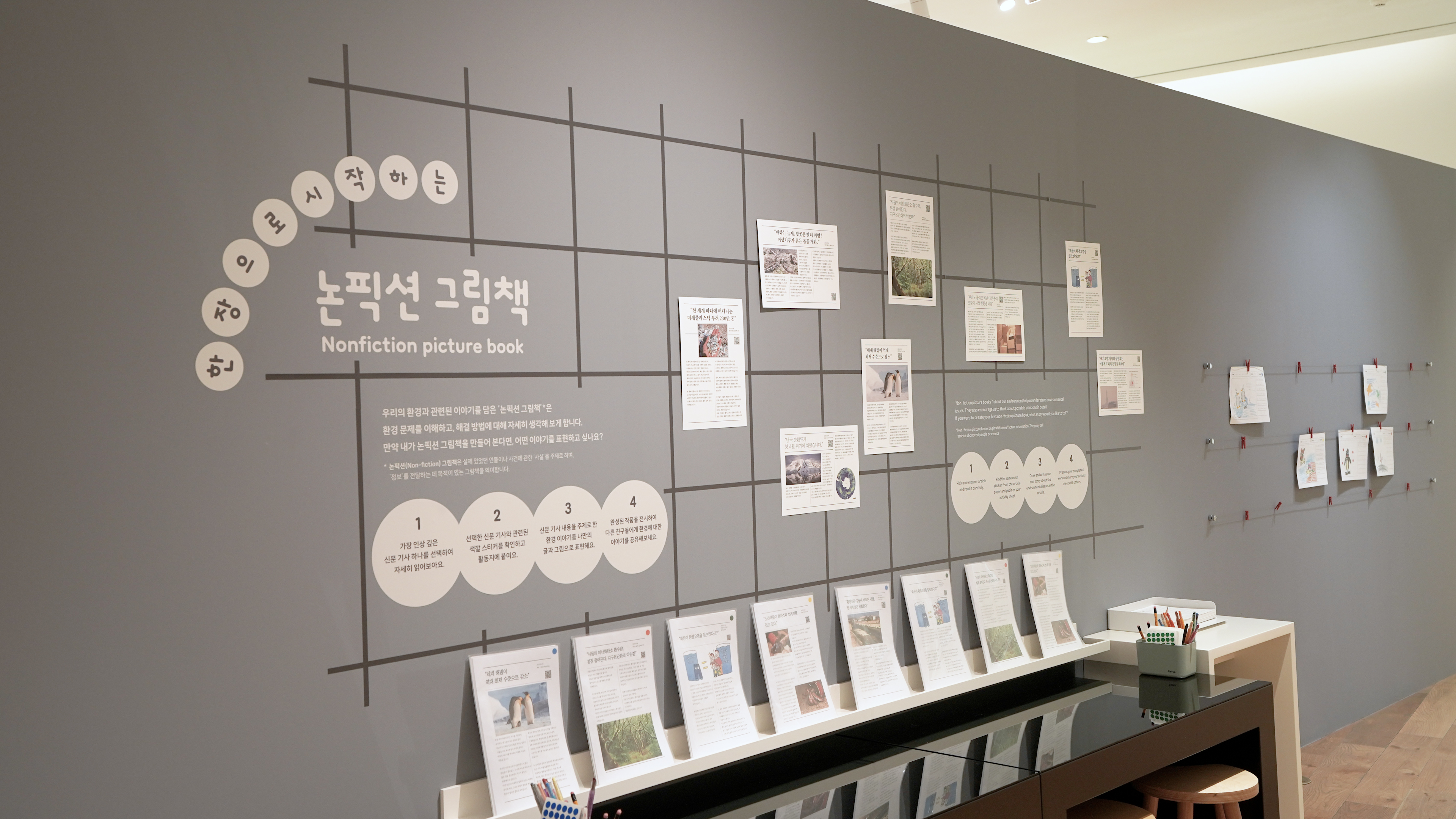 또 다른 한쪽에서는 ‘논픽션 그림책’ 만들기 활동이 펼쳐집니다. 환경 그림책은 실재하는 사실에 기반을 둔 ‘논픽션’ 장르입니다. 이 활동에서는 ‘물’, ‘일상생활’, ‘공기’, ‘플라스틱’이라는 네 가지 테마의 신문 기사를 읽고, 그 내용을 바탕으로 자신만의 그림책을 만들어봅니다. 완성된 그림책은 공간 안에 전시되어, 다른 친구들과 함께 감상하며 환경에 대해 자연스럽게 이야기를 나누는 자리로 이어집니다.