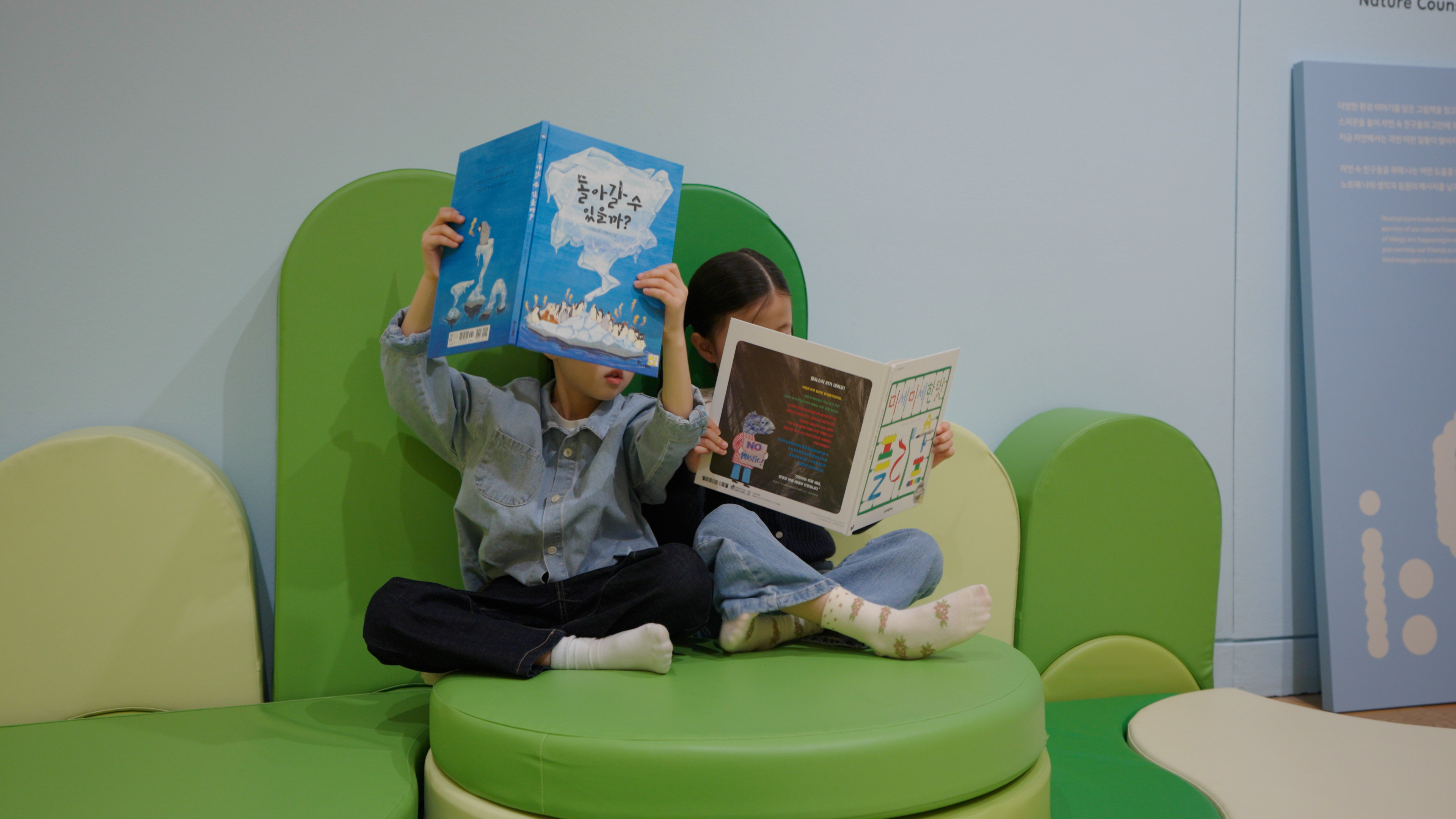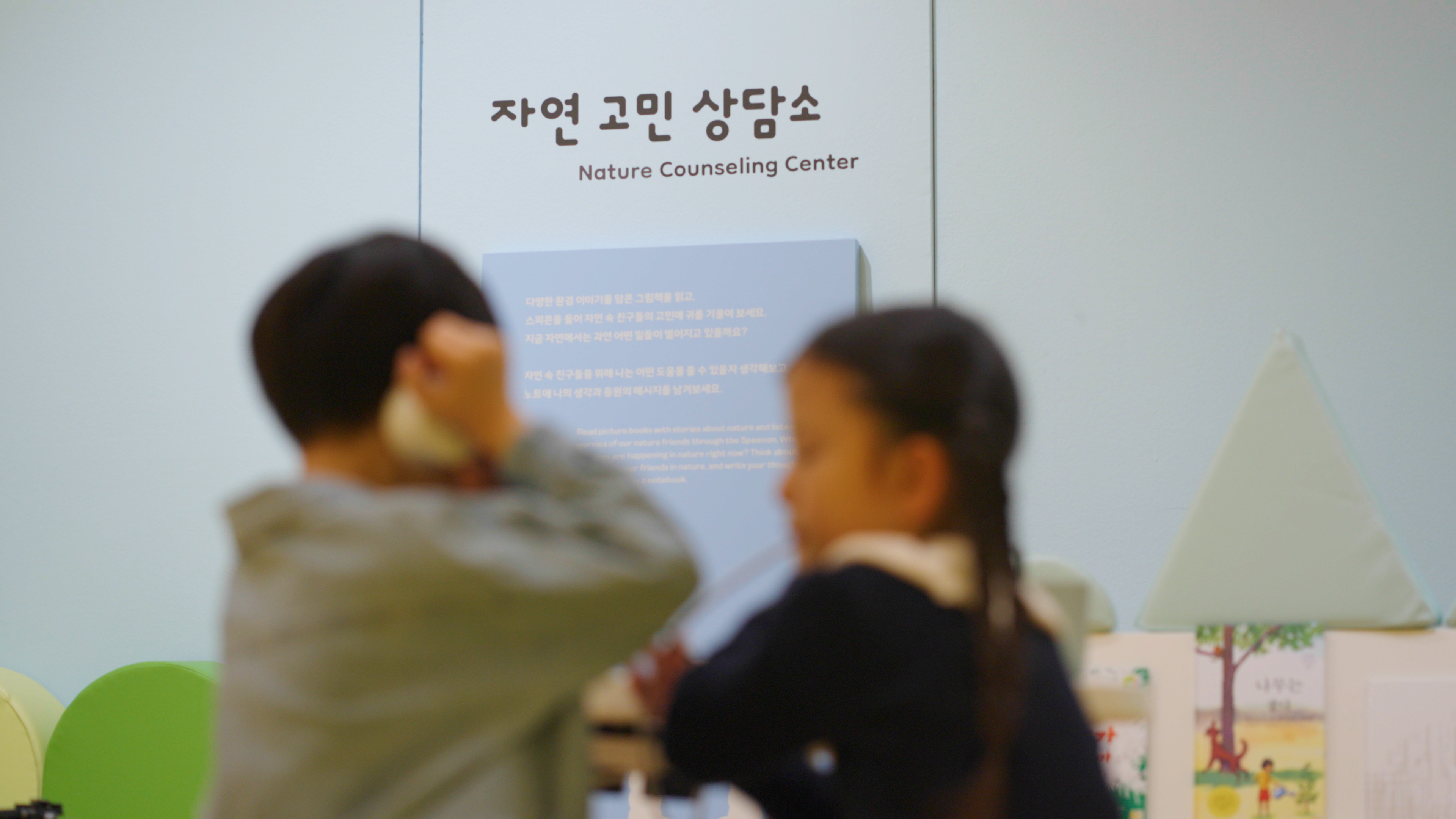 5층 ‘함께하는 오늘’ 전시장 한편에는 마치 작은 숲속 놀이터처럼 꾸며진 활동 공간이 마련되어 있습니다. 이곳에서는 다양한 환경 이야기를 담은 그림책을 읽고, 스피콘을 귀에 대고 자연 속 친구들의 속마음을 들어볼 수 있어요.