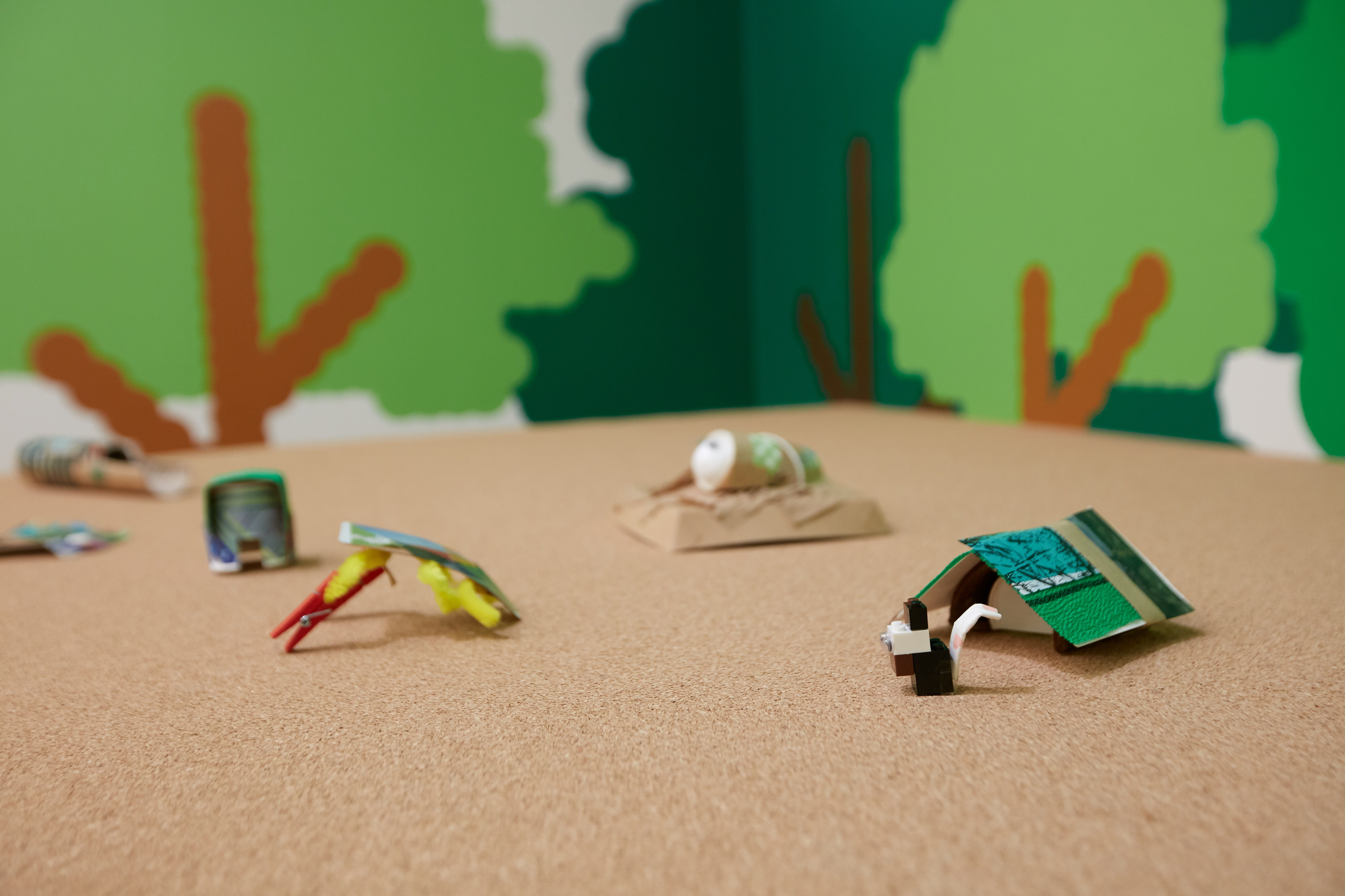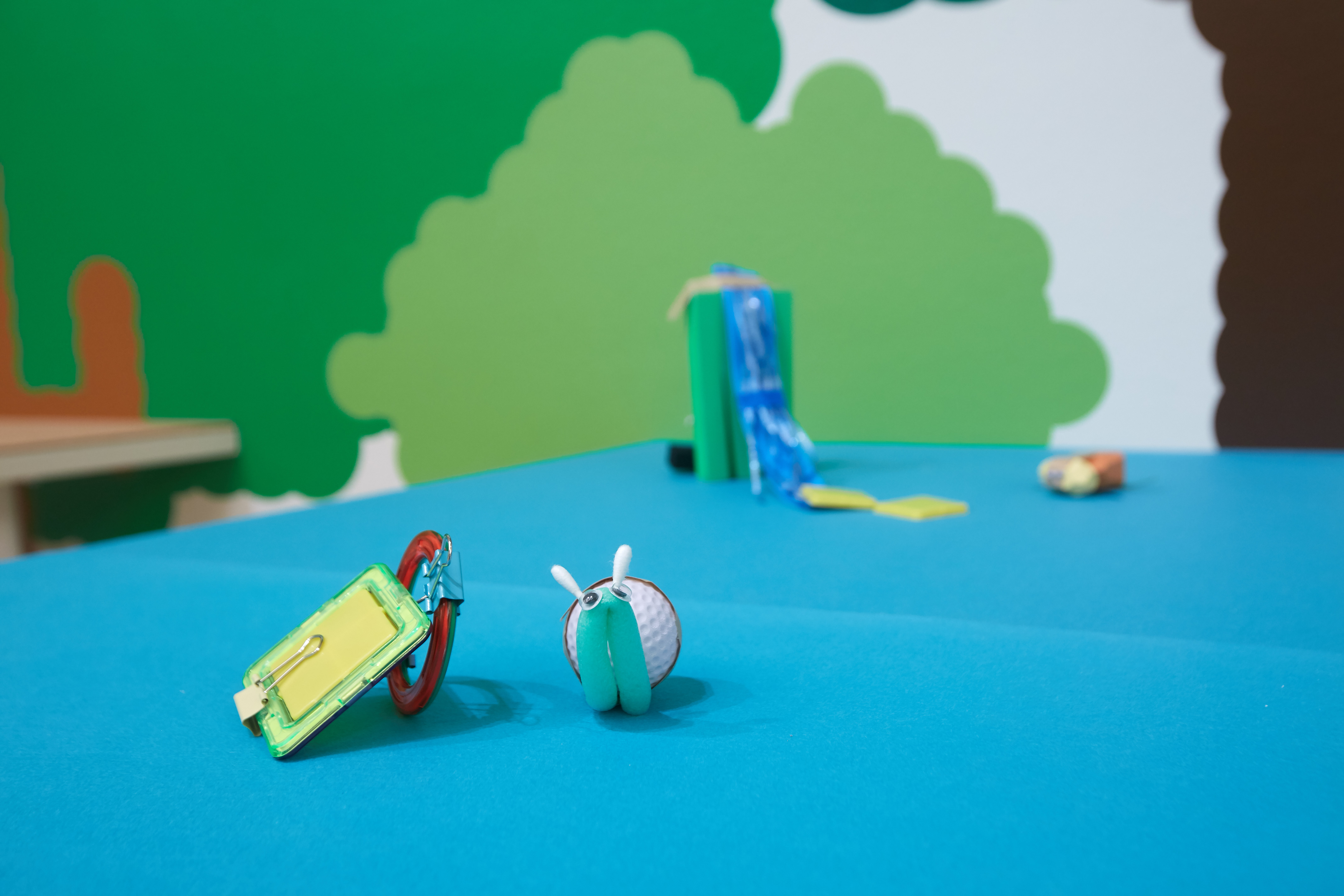 곤충과 동물 친구들은 숲속에서 어떤 놀이를 좋아할까요? 6층에 마련된 ‘자연 놀이 창작소’는 아이들이 자연 친구 카드 속 동물의 성격과 취향을 읽어보고, 그들을 위한 놀이터를 직접 설계하고 만들어보는 공간입니다. 앞서 살펴본 김유대 작가의 <이런 멋쟁이들!>에서 등장한 반딧불이, 물방개와 한병호 작가의 <수달이 오던 날>의 수달을 자연 친구 카드에서 다시 만나봅니다. 물을 좋아하는 동물 친구를 위해 ‘워터파크 미끄럼틀’을, 조용한 시간을 좋아하는 곤충 친구를 위해 ‘숨바꼭질 이불’을 만들어주는 과정에서 아이들은 자연과의 깊은 교감을 나누게 됩니다. 이곳에서 사용되는 재료 역시 미술관에서 오랫동안 쓰이지 않던 물건들로, 버려졌던 물건들이 새로운 쓰임을 가진 물건으로 재탄생할 수 있음을 보여줍니다.