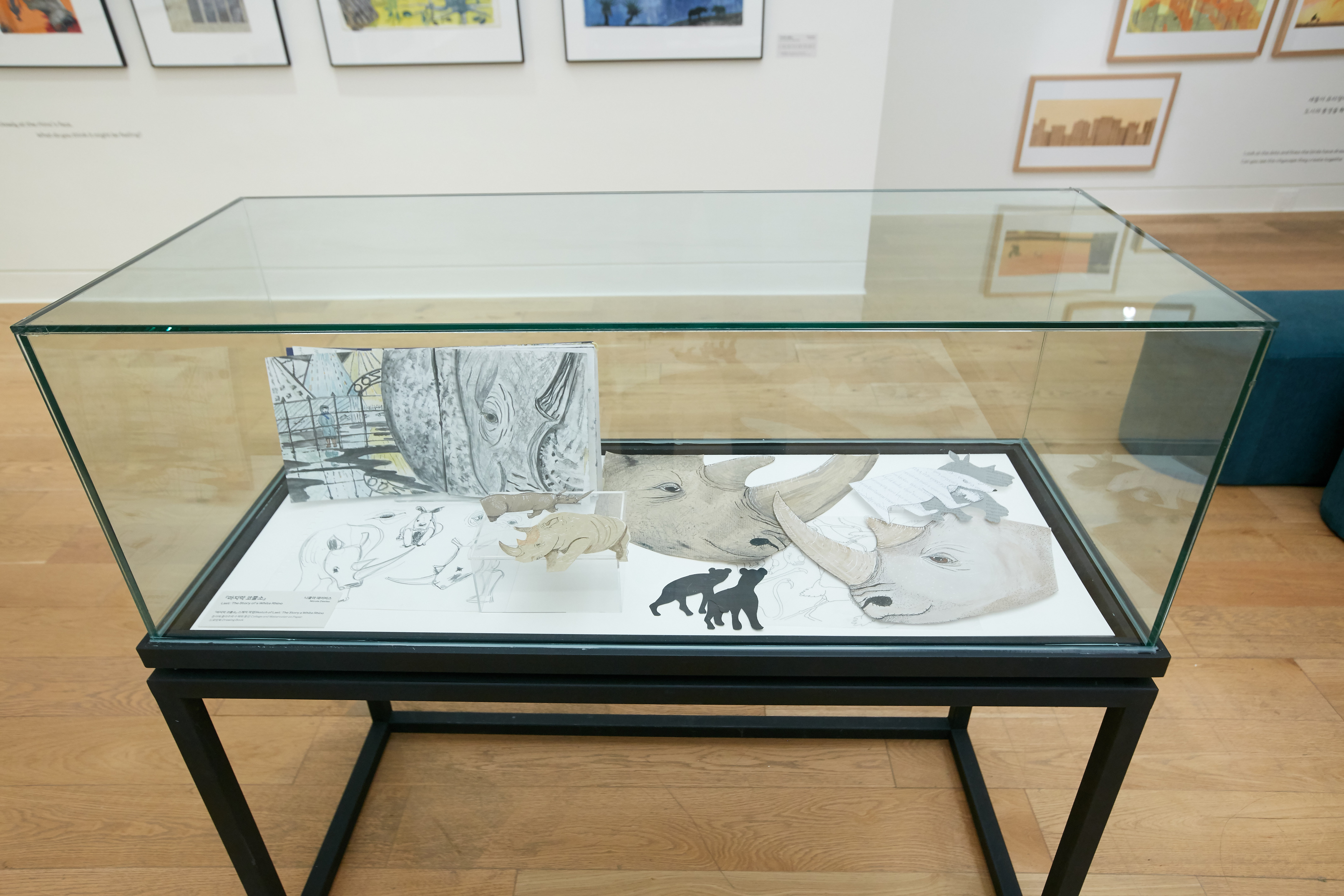 자연과 도시에서 안전하고 편안하게 살 수 있는 환경이 점점 사라지고 있습니다. 이명애는 아주 짧은 시간 안에 세상의 모든 것들이 뒤섞일 수 있다고 생각했습니다. 이러한 풍경을 스노볼로 묘사한 <10초>는 인간의 욕심으로 인해 자연의 수많은 생명들이 삶의 터전을 잃어가는 현실을 짧지만 묵직한 메시지로 전달합니다. 우리가 당연하게 여겨온 평화로운 일상이 무너지는 순간, 그 무게를 되짚어보게 합니다. 니콜라 데이비스의 <마지막 코뿔소>는 북아프리카 흰코뿔소의 실화를 바탕으로 한 작품입니다. 지구상에 단 두 마리만 남은 코뿔소의 이야기에는 깊은 슬픔과 두려움이 서려 있으며, 콜라주 기법으로 표현된 장면들은 멸종이라는 현실을 더욱 생생하게 전달합니다.