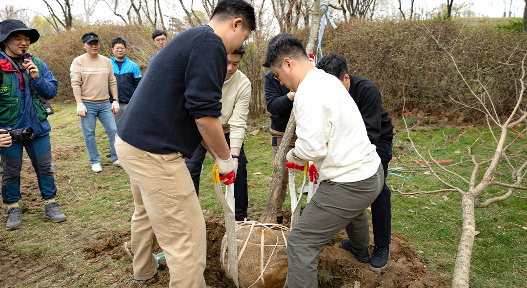 공원의 녹지량을 늘리면 폭염, 미세먼지 등의 도시 환경 문제로 인한 피해가 줄어들어요. 도시의 생물 다양성도 한층 더 풍요로워지죠. 나무 심기는 사람과 작은 동물들이 공존하는 도시를 만드는 작지만 큰 실천인 셈이에요. 동료들은 이번 활동의 취지를 설명하는 생명의숲 이기세 팀장의 말에 공감하며 큰 책임감과 의지를 보였어요.