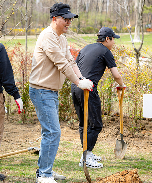 나무 한 그루 한 그루에 담긴 현대백화점 고객님들의 따뜻한 마음이 느껴졌기 때문일까요? 나무를 심는 동료들의 얼굴엔 땀과 함께 미소가 맺혔어요. ‘으쌰으쌰' 구호를 외치며 기운차게 나무를 심는 직원들도 있었죠. 처음 해보는 나무 심기 활동이 조금은 어색하고 낯설지라도, 동료들은 서로 힘을 북돋아 주며 열심히 나무를 심었어요.