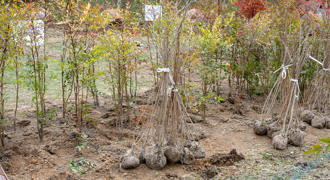 나무를 심을 공간으로 이동하니, 용산가족공원에 녹색 생명을 싹틔울 이팝나무, 산수유나무, 배롱나무, 화살나무, 수수꽃다리의 묘목이 보이네요! 모두 서울마이트리 ‘내 나무 갖기’ 기부 프로젝트를 통해 기부해 주신 수종들이에요.