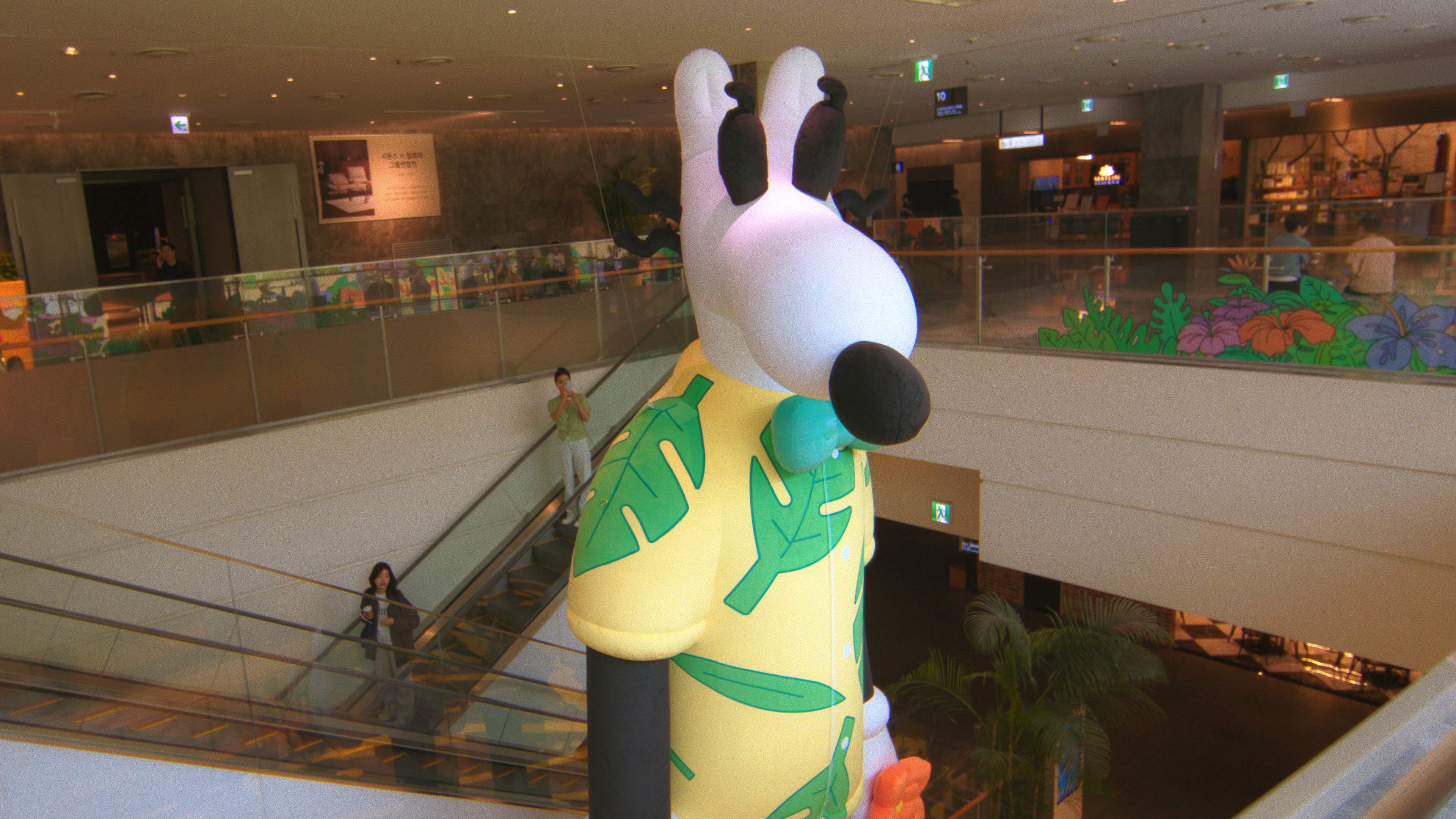 풍선이라는 매체 자체가 저에겐 아직 신선한 도전이었습니다. 야외에서 조형물을 만들어본 적은 있지만, 이런 방식은 처음이었으니까요. 실외는 바람, 날씨 같은 변수들이 많지만 이번엔 실내에서 서있는 형태의 풍선을 작업할 수 있었습니다. 또 하나 재미있었던 것은 멜로에게 옷을 입힌 것입니다. 평소 멜로는 흑백의 미니멀한 모습인데, 이렇게 큰 조형물에 의상을 입히니 캐릭터에 새로운 생명을 불어넣는 것 같았습니다.