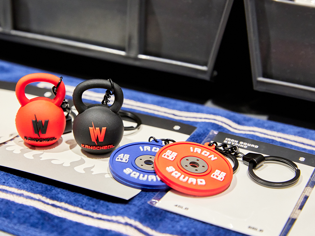 헬스장에 가면 볼 수 있는 원판과 케틀벨 모양으로 만든 웨이트 키링부터 착화감 좋은 보급 슬리퍼, 위트 있는 문구가 새겨진 스포츠 타월과 키치한 디자인의 물병, 스포티한 무드의 볼캡, 각종 스티커까지! 하나둘 바구니에 담다 보면 끝이 없을 거예요.