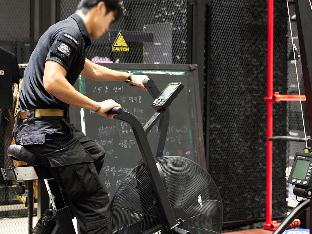 조정 선수들이 훈련할 때 쓰는 ‘로잉 머신’부터 발을 구르는 속도에 맞춰 달리기 속도를 조절할 수 있는 ‘트레드밀’, 스키를 타듯 손잡이를 당기는 방식의 ‘스키’와 팔과 발 모두를 움직여야 하는 ‘에코바이크’까지. 강철부대원의 기록에 도전해 보세요.
