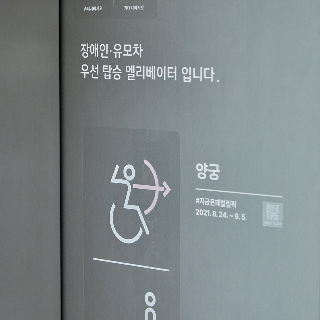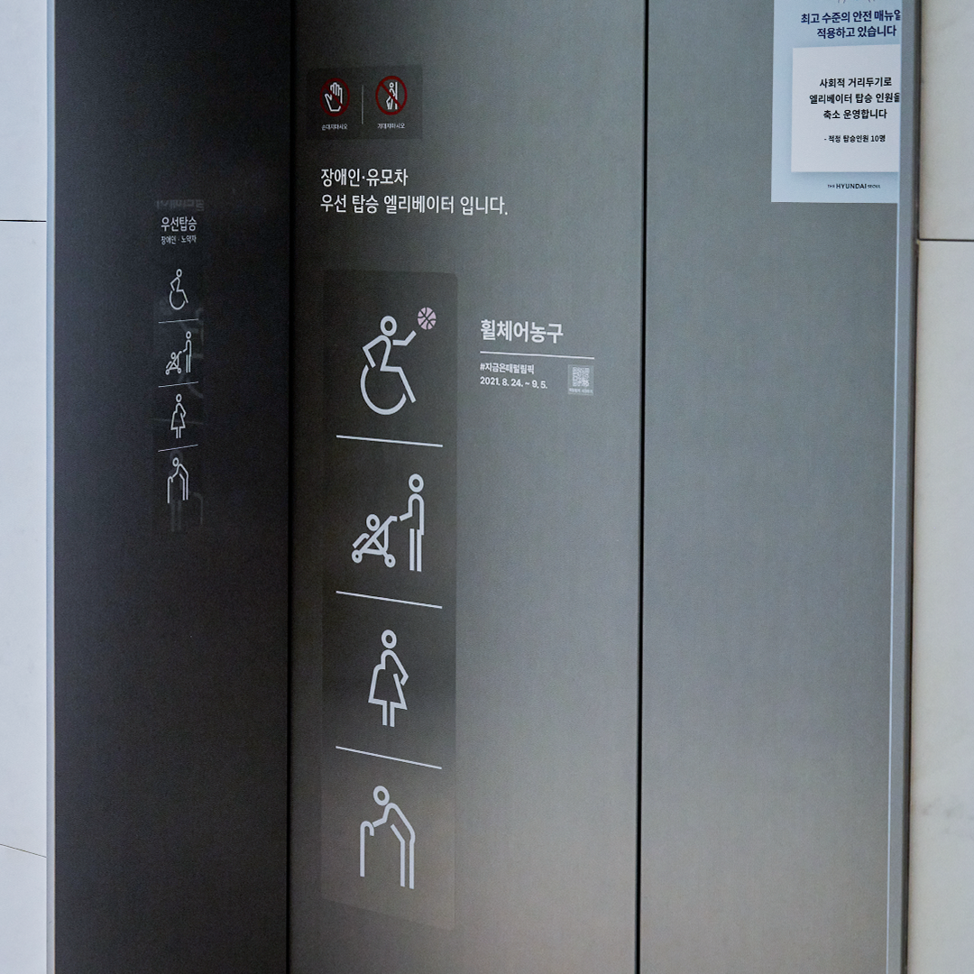 도쿄올림픽 개막식에서 화제가 되었던 픽토그램 재현 퍼포먼스, 기억하시죠? 픽토그램은 어떤 사람이 보더라도 같은 의미로 통할 수 있는 그림으로 된 언어체계입니다. 더현대 서울에는 패럴림픽 종목을 상징화한 픽토그램이 지하 6층부터 지상 6층까지, 총 72개 엘리베이터에 스티커로 부착되어 있어 쉽게 확인할 수 있는데요. 말로 하지 않아도 우리 선수단을 응원하는 마음이 모두 전해지는 듯합니다.