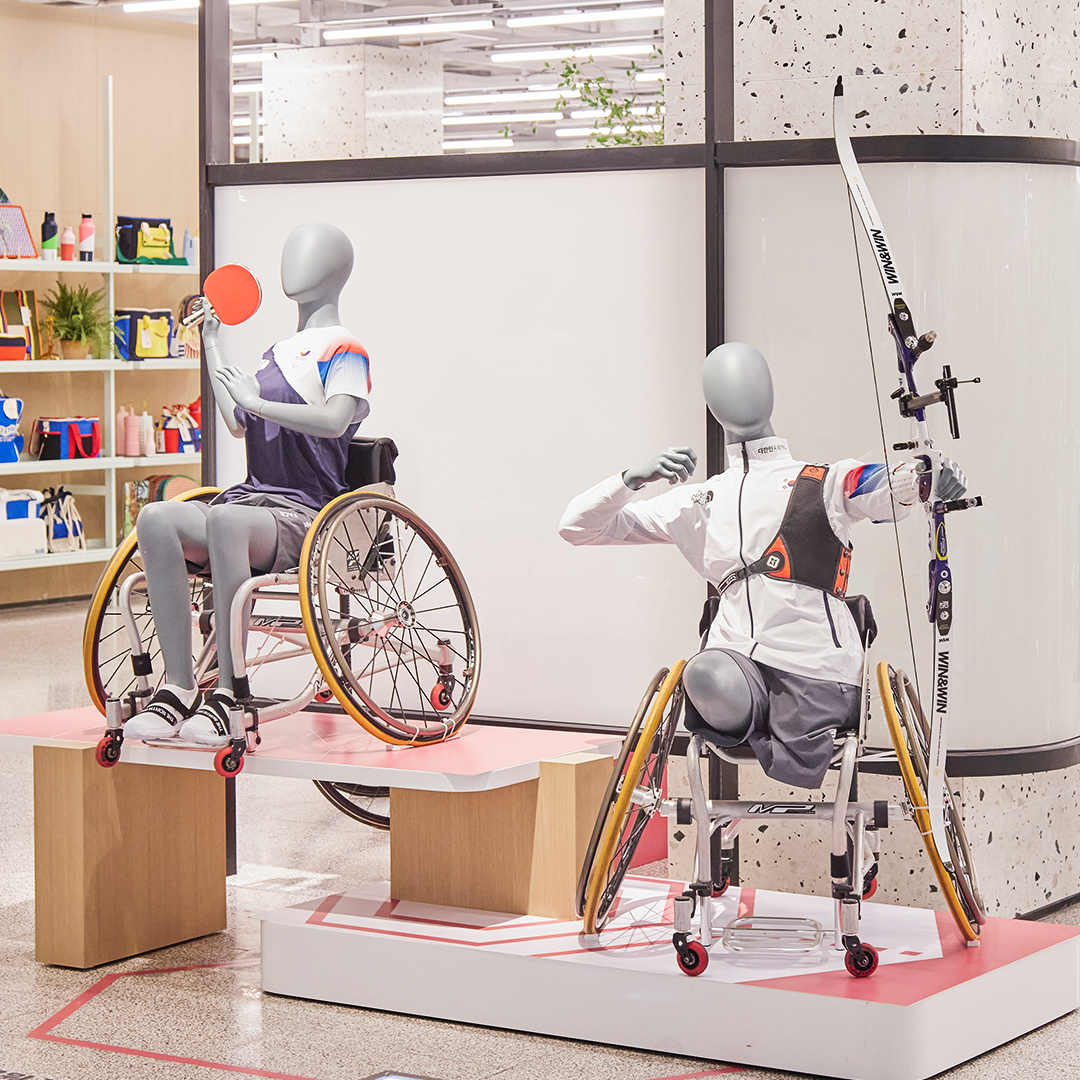 다채로운 스포츠 브랜드와 리빙 제품을 만나볼 수 있는 4층 에스컬레이터 앞, 특별한 모습의 마네킹들을 확인할 수 있는데요. 바로 패럴림픽에 출전하는 국가대표 선수들의 모습을 생생하게 형상화한 것이랍니다. 우리 국가대표 단복을 입고 있는 육상, 사이클, 탁구, 그리고 양궁 선수들이 단상에 올라간 모습이 마치 시상대 위에 선 것처럼 듬직하네요.