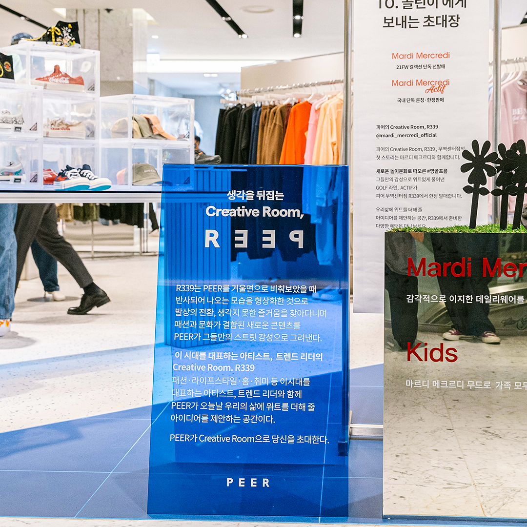 무역센터점 피어에서는 문화와 패션을 결합한 새로운 콘텐츠를 제안하는 ‘R339’ 존도 찾아볼 수 있는데요. R339은 ‘PEER’를 거울로 보았을 때 좌우가 바뀐 모습에서 착안한, 생각을 뒤집는 ‘Creative Room’이에요. 혁신에 혁신을 더한 R339에서 발상의 전환과 즐거운 서프라이즈를 선보입니다.