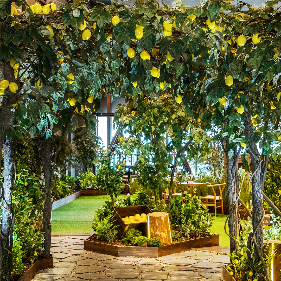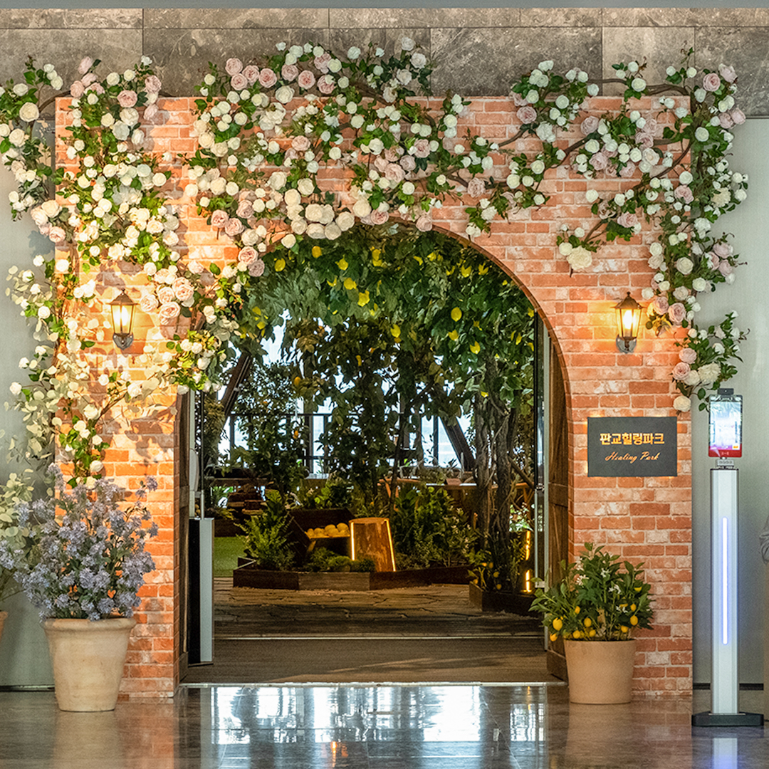 먼저 판교랜드의 하이라이트인 ‘힐링파크’로 들어가 볼까요? 기존 10층 토파즈홀이 피톤치드가 가득한 라운지로 탈바꿈되었는데요. 입구에서부터 남부 유럽의 정취를 옮겨 담은 레몬 터널이 우리를 맞이하며 상큼한 레몬향이 마음과 몸의 모든 감각을 열어주네요.