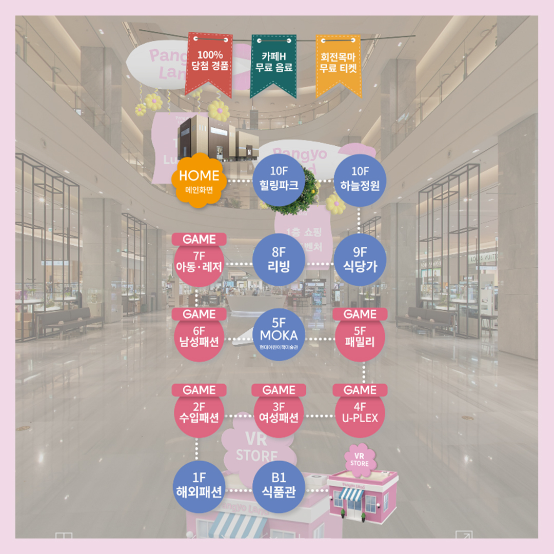 ‘VR 판교랜드’란 VR 기술을 통해 지하 1층부터 10층까지 판교점의 모든 층을 360도로 촬영 후 놀이기구, 비행선, 게임기 등 여러 3D 그래픽을 합성하여 만든 가상의 백화점입니다. 실제 판교점을 그대로 담아내서 마치 백화점을 걷고 있는 듯한 느낌이 들어요. VR 화면에 있는 화살표를 터치하면 매장을 이동할 수 있고, 비행선 모양의 아이콘을 터치하면 판교점에서 진행하고 있는 행사 정보도 알 수 있어요.