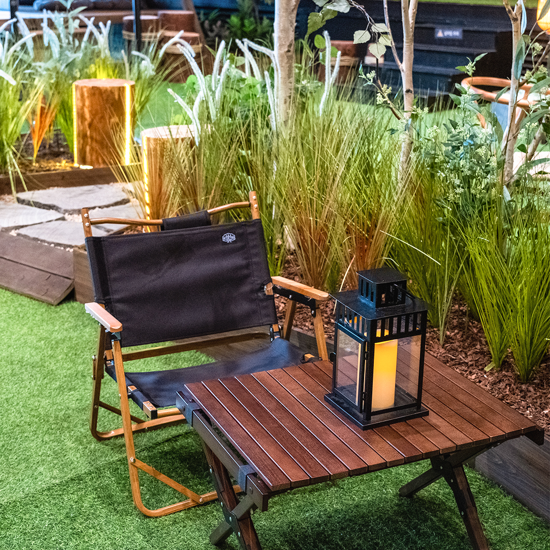 북미 캐빈을 닮은 삼각 오두막을 바라보며 자연의 소리에 귀 기울이고 있으면 글램핑도 차박도 부럽지 않은 시간이 후딱 흘러갑니다. 곳곳에 캠핑의자와 통나무 원목 조명, 그리고 캔들 랜턴의 은은한 조명까지 더해져서 캠핑 감성이 차오르네요.
