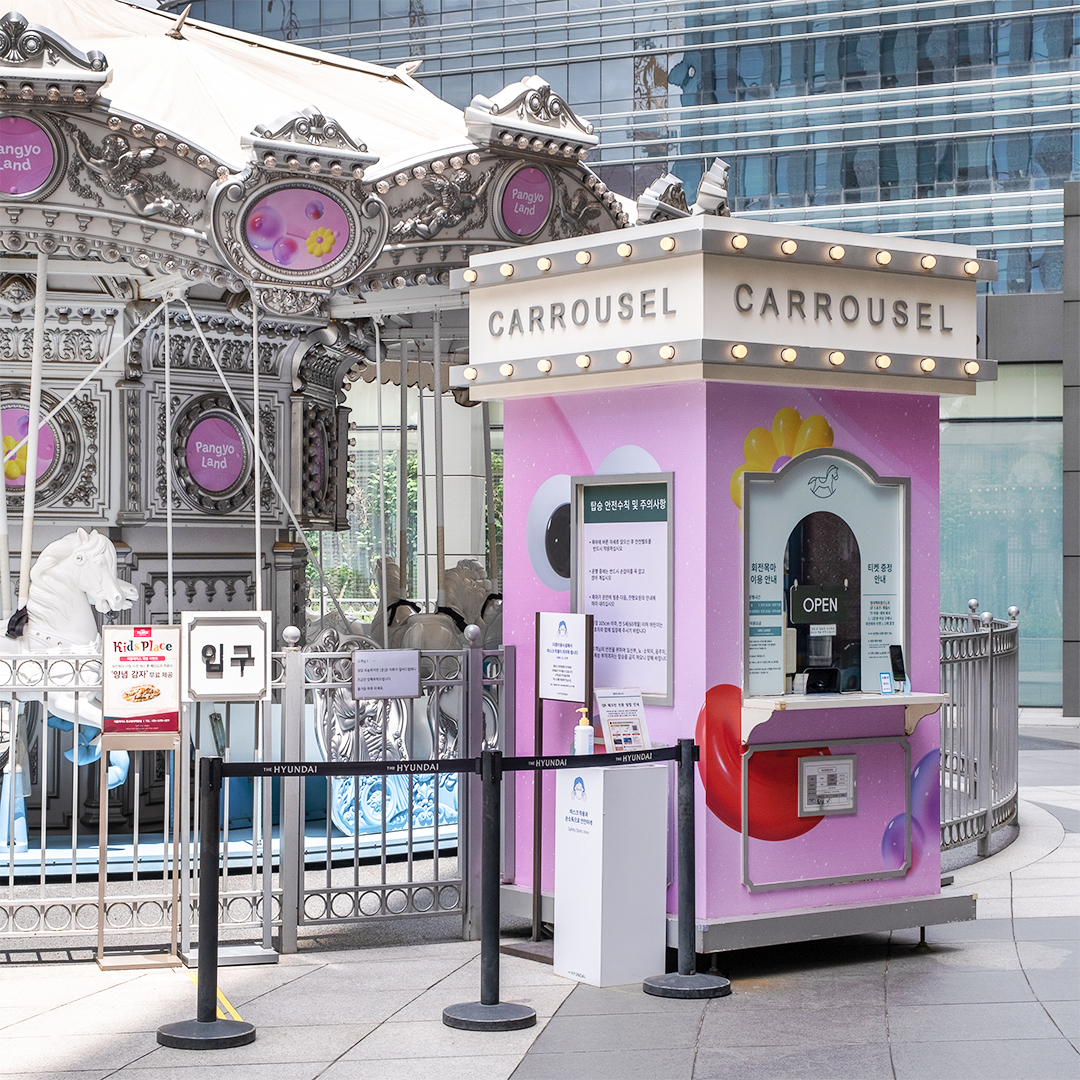 놀이공원이 된 백화점 ‘판교랜드’의 분위기를 한껏 더 업시켜 줄 회전목마를 타러 5층 패밀리가든으로 나가볼까요? 여기서 팁! VR 판교랜드 5층 회전목마 부스 앞에서 무료 티켓을 받아 볼 수 있답니다.