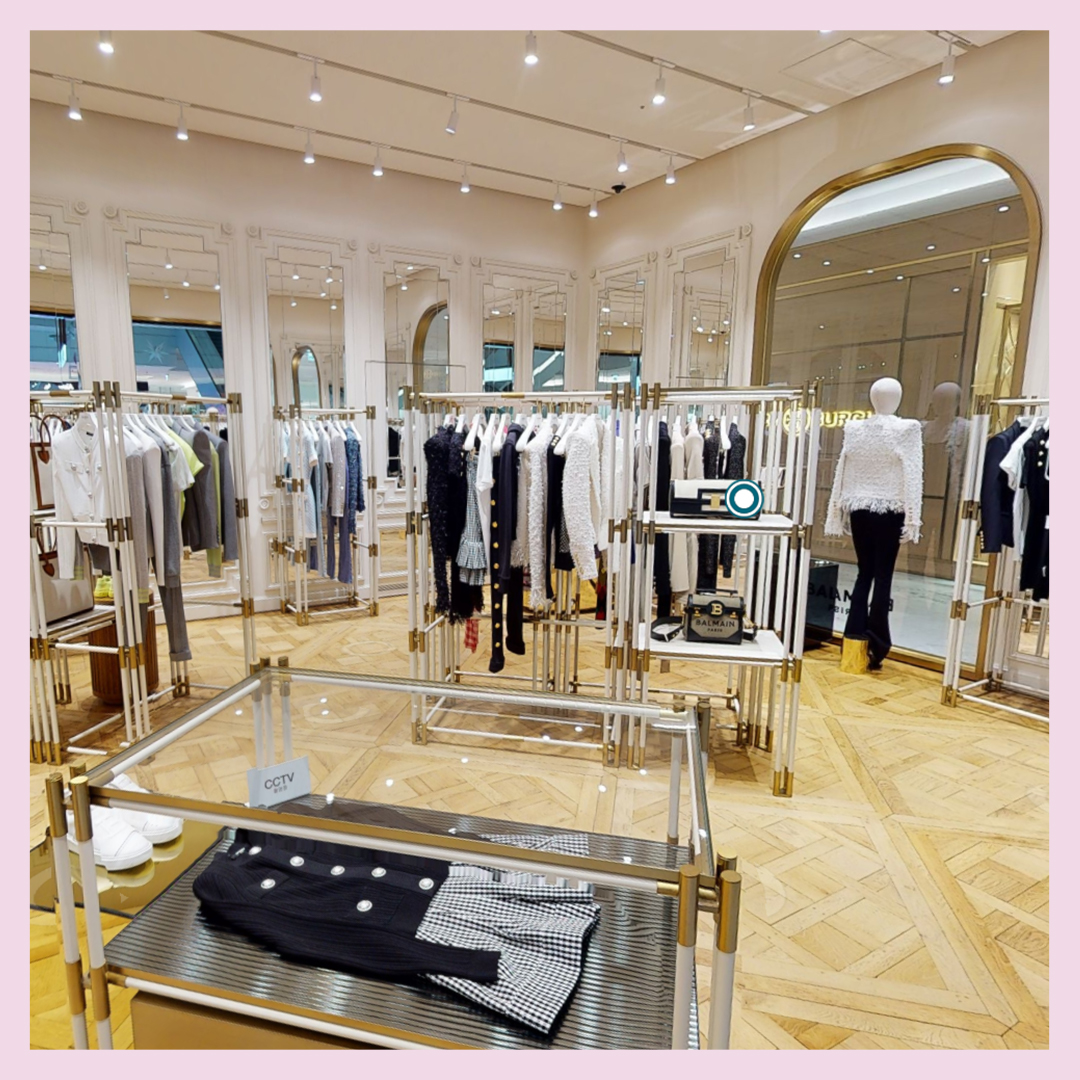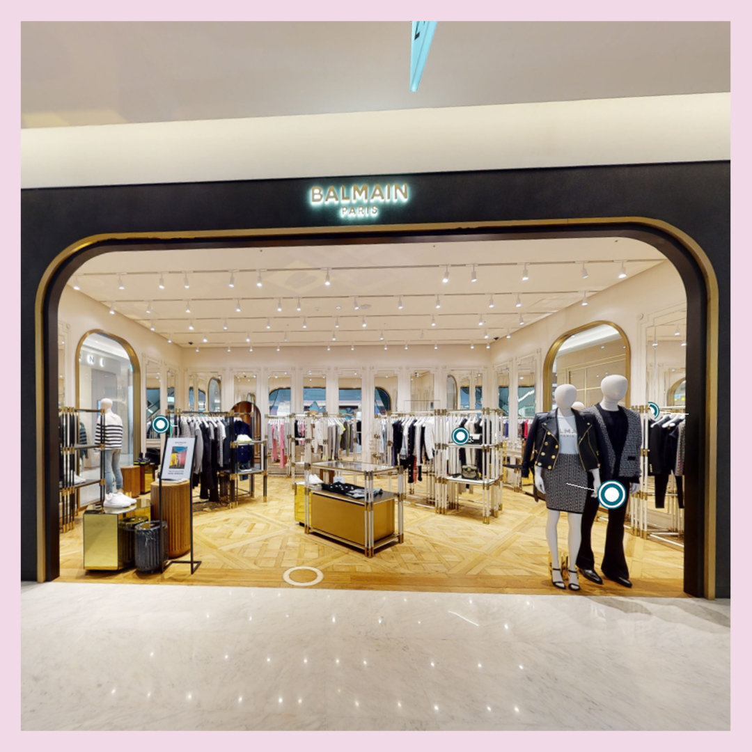 ‘VR 판교랜드’란 VR 기술을 통해 지하 1층부터 10층까지 판교점의 모든 층을 360도로 촬영 후 놀이기구, 비행선, 게임기 등 여러 3D 그래픽을 합성하여 만든 가상의 백화점입니다. 실제 판교점을 그대로 담아내서 마치 백화점을 걷고 있는 듯한 느낌이 들어요. VR 화면에 있는 화살표를 터치하면 매장을 이동할 수 있고, 비행선 모양의 아이콘을 터치하면 판교점에서 진행하고 있는 행사 정보도 알 수 있어요.