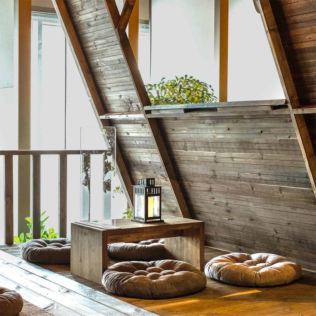 북미 캐빈을 닮은 삼각 오두막을 바라보며 자연의 소리에 귀 기울이고 있으면 글램핑도 차박도 부럽지 않은 시간이 후딱 흘러갑니다. 곳곳에 캠핑의자와 통나무 원목 조명, 그리고 캔들 랜턴의 은은한 조명까지 더해져서 캠핑 감성이 차오르네요.