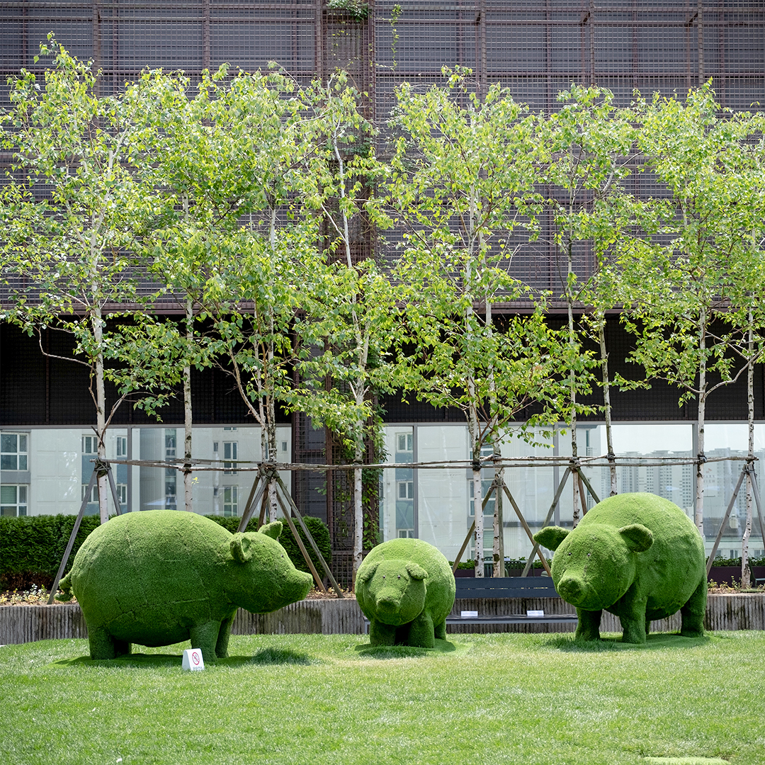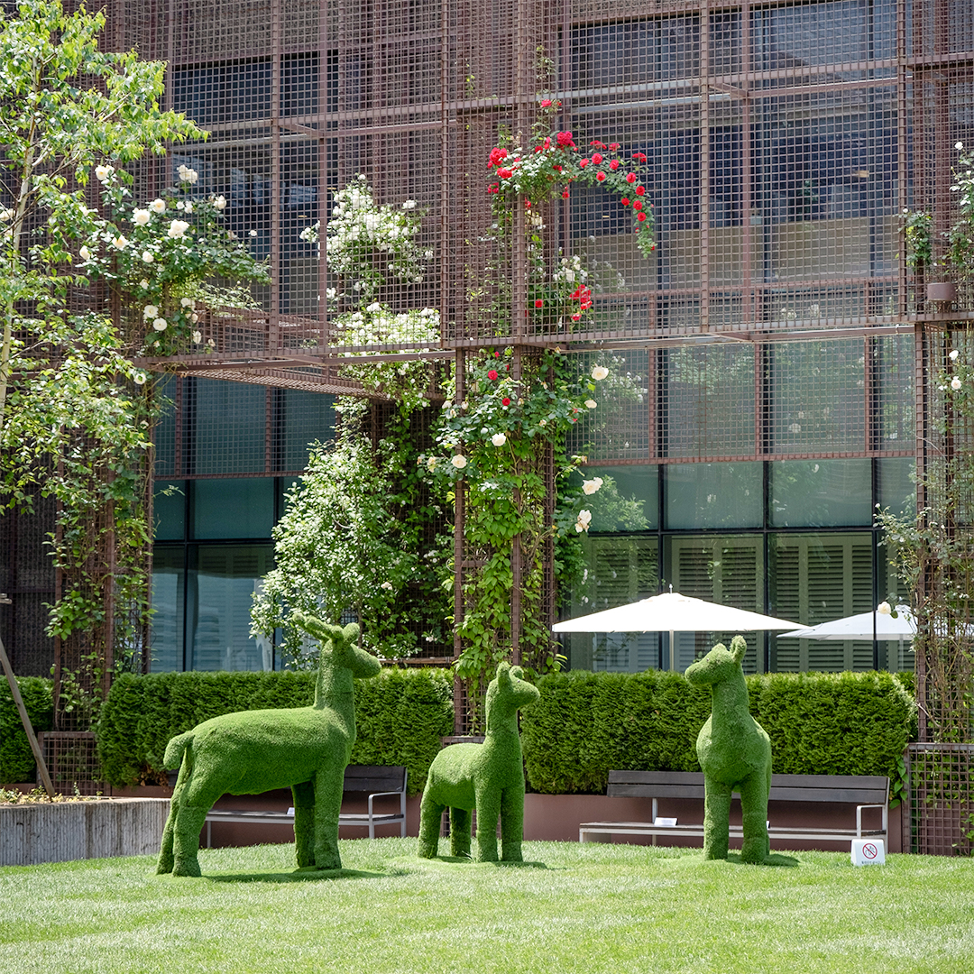 ‘힐링파크’에서 차오른 자연의 감성은 같은 층 하늘정원으로 이어지는데요. 유럽의 정원을 닮은 하늘정원에 올해도 토피어리가 돌아왔습니다. 지난해 곰과 코끼리에 이어 올해에는 사슴과 돼지가 하늘정원에 내려왔는데요. 사슴 가족과 돼지 가족의 하늘정원 나들이가 평화로워 보이네요.