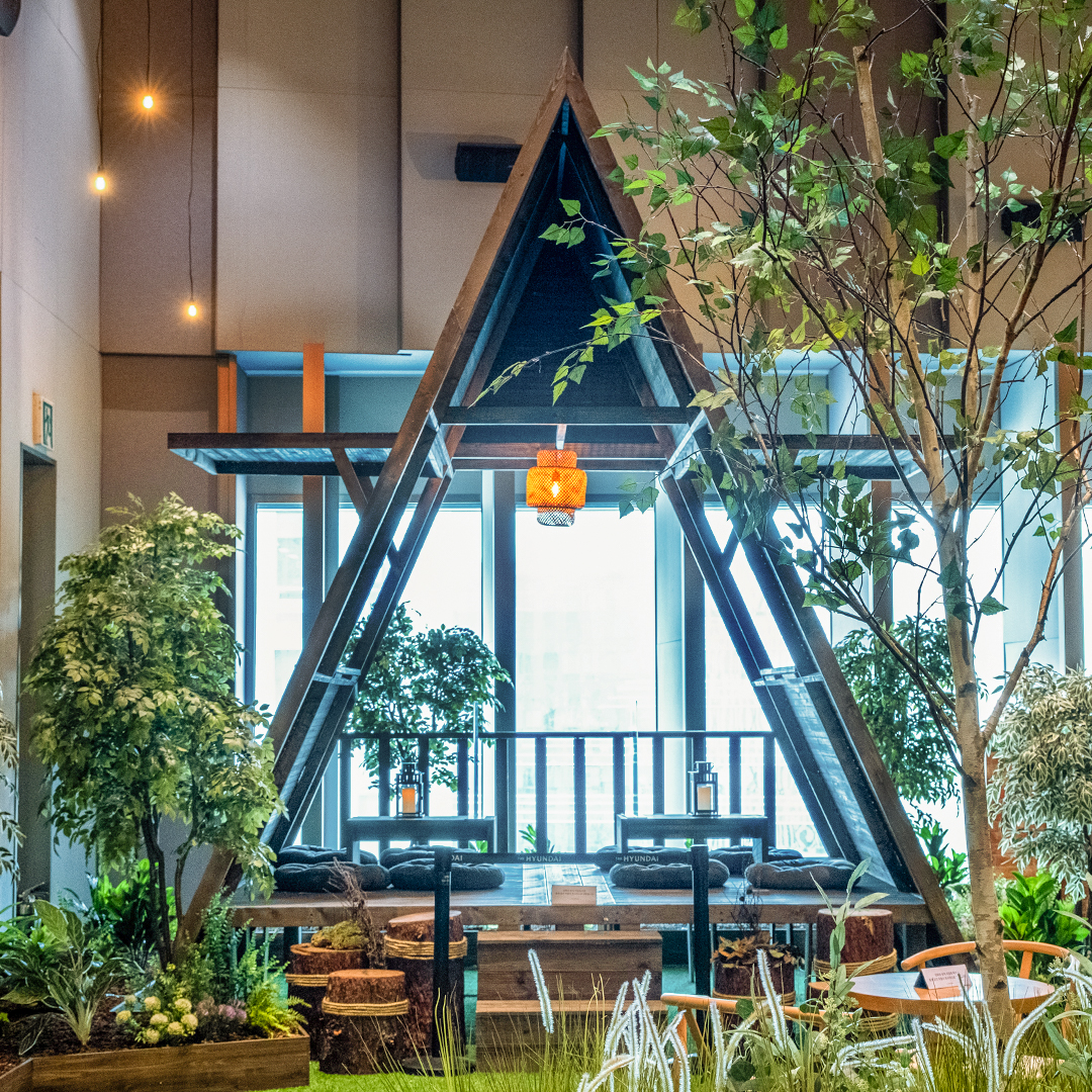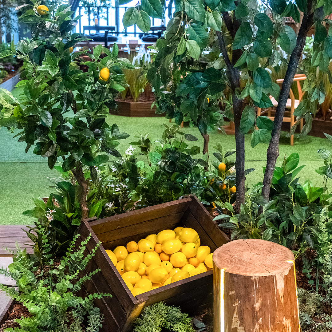먼저 판교랜드의 하이라이트인 ‘힐링파크’로 들어가 볼까요? 기존 10층 토파즈홀이 피톤치드가 가득한 라운지로 탈바꿈되었는데요. 입구에서부터 남부 유럽의 정취를 옮겨 담은 레몬 터널이 우리를 맞이하며 상큼한 레몬향이 마음과 몸의 모든 감각을 열어주네요.