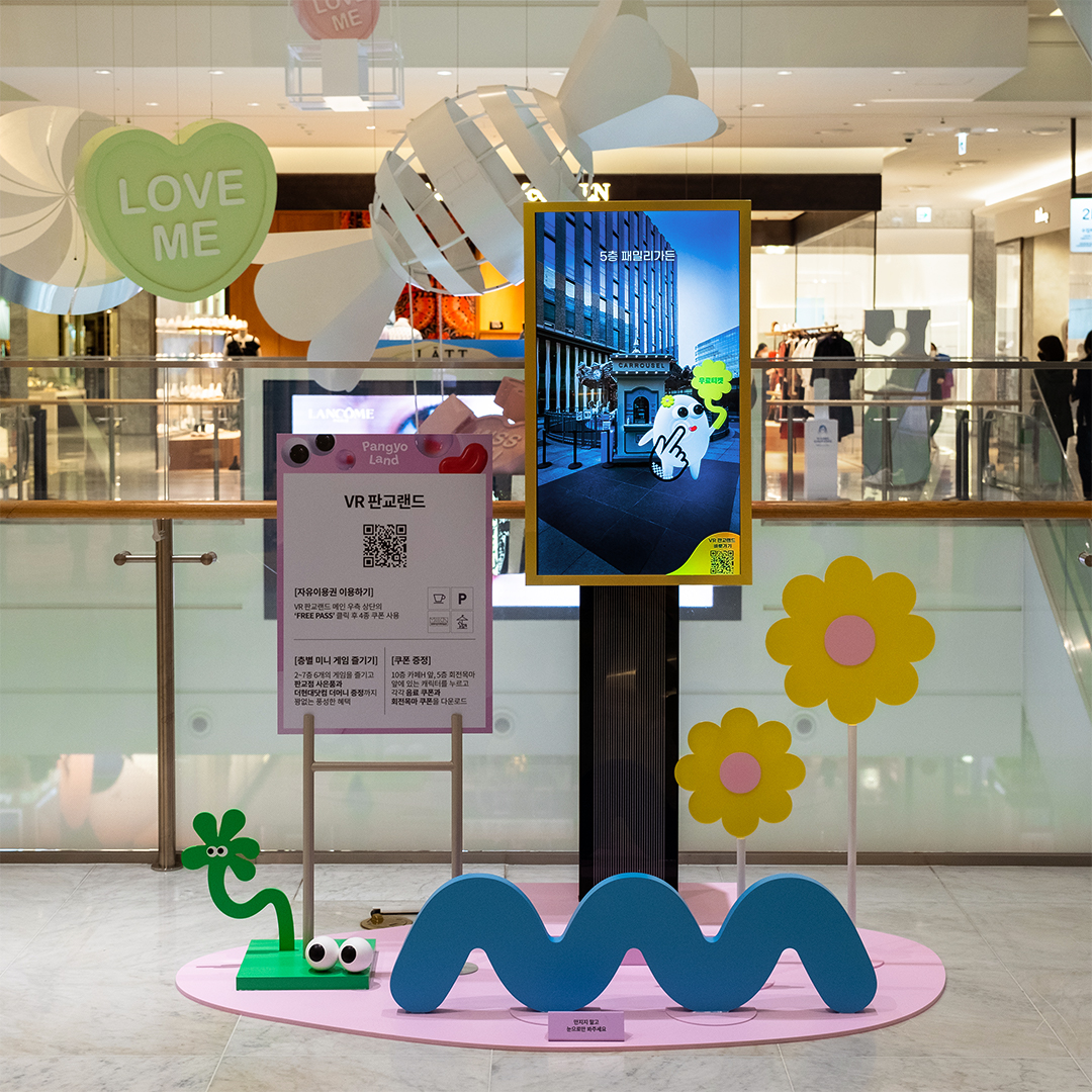 온라인 ‘VR 판교랜드'로도 잘 따라오고 계시죠? 그렇다면 입구 정면에 놓인 ‘AR 포토존’도 보셨나요? ‘AR 포토존’은 온라인 ‘VR 판교랜드’와 오프라인 판교랜드를 잇는 다리와 같은데요. ‘VR 판교랜드'에서 발견한 ‘AR 포토존’을 클릭하거나 판교점 공식 인스타그램에서 ‘AR 필터’ 기능으로 현장에서 ‘AR 포토존’ 안내 표지판을 찰칵 촬영하면, 마법같은 가상현실이 펼쳐집니다.