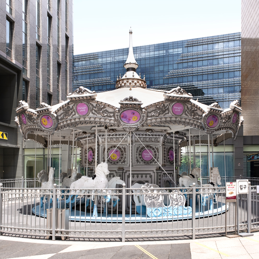 놀이공원이 된 백화점 ‘판교랜드’의 분위기를 한껏 더 업시켜 줄 회전목마를 타러 5층 패밀리가든으로 나가볼까요? 여기서 팁! VR 판교랜드 5층 회전목마 부스 앞에서 무료 티켓을 받아 볼 수 있답니다.