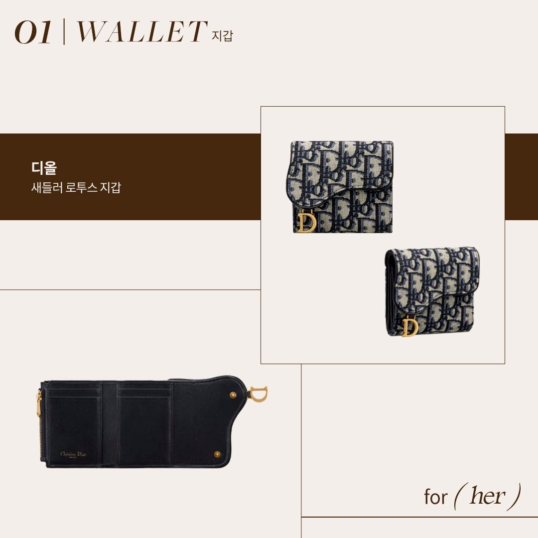 디올 새들러 백의 아이코닉한 디자인 패턴을 고스란히 가져온 지갑입니다. 브랜드 아이덴티티가 그대로 녹아 있는 비대칭 플랩과 앤틱한 메탈 소재의 스터럽이 포인트가 되어 데일리 아이템으로 사용해도 질리지 않죠. 자카드 소재로 제작되어 고급스러움은 물론, 패턴 내 블루 컬러는 오묘한 분위기를 만들어 내기도 합니다. 4개의 카드 슬롯과 1개의 지폐 수납공간, 2개의 패치 포켓과 1개의 지퍼 포켓을 가지고 있어 용도에 맞게 수납을 분리하기에도 편리해요.