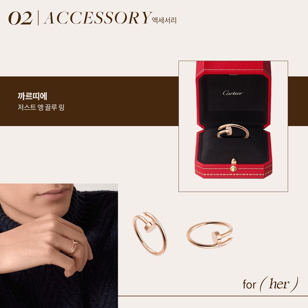 때로는 많은 고민이 필요하지 않을 수도 있습니다. 이번 밸런타인데이를 맞아 보다 의미 있는 선물을 하고 싶다면 반지가 정말 좋은 선택지가 될 테니까요. 까르띠에의 상징과도 같은 저스트 앵 끌루 링은 못을 우아한 오브제로 승화시켜, 깔끔하면서도 독특한 디자인이 더욱 매력적으로 느껴지는 반지입니다. 핑크 골드와 화이트 골드, 옐로우 골드, 3가지 색상 중 연인의 피부 톤에 어울리는 것으로 고를 수 있으며, 남성들도 부담 없이 착용하기 좋아 커플링으로도 추천합니다.