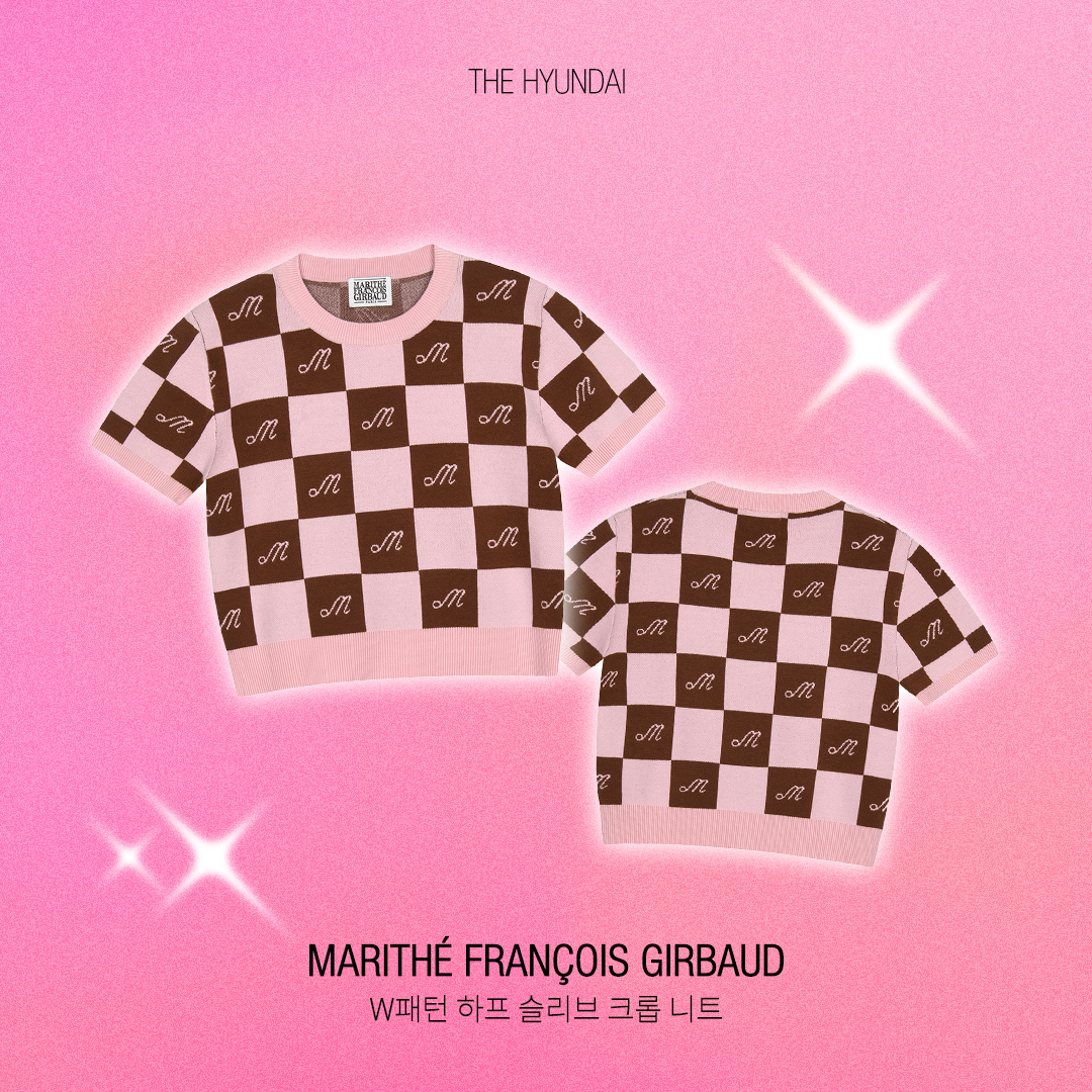 티셔츠는 너무 캐주얼해 보이고, 셔츠를 입기에는 부담스러울 때, 서머 니트를 활용해 보세요. 경쾌한 로고 플레이의 매력이 느껴지는 마리떼프랑소와저버의 크롭 니트는 핑크와 브라운 컬러가 조화롭게 이루어졌는데요. 90년대의 무드까지 느껴져 더욱 매력적인 아이템입니다. 어떤 하의와 매치할지 고민된다면 체커보드 패턴의 컬러와 맞춰보세요!