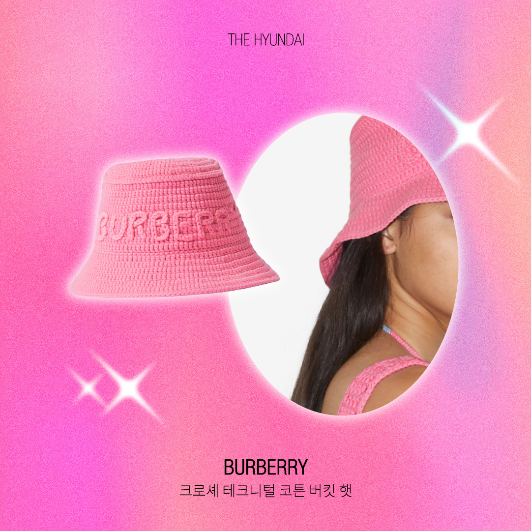 강렬한 자외선으로부터 피부를 지켜주는 여름용 모자도 하나 보고 가세요. 버버리의 이 버킷 햇은 크로셰 제품으로 여름철에도 가볍게 착용할 수 있습니다. 파스텔 톤의 핑크 컬러로 되어 있어 심플한 컬러나 디자인의 룩에 포인트를 주기에 제격이죠. 수작업으로 완성한 버버리 로고 또한 모자와 같은 원단이라 세련된 느낌으로 연출할 수 있어요.