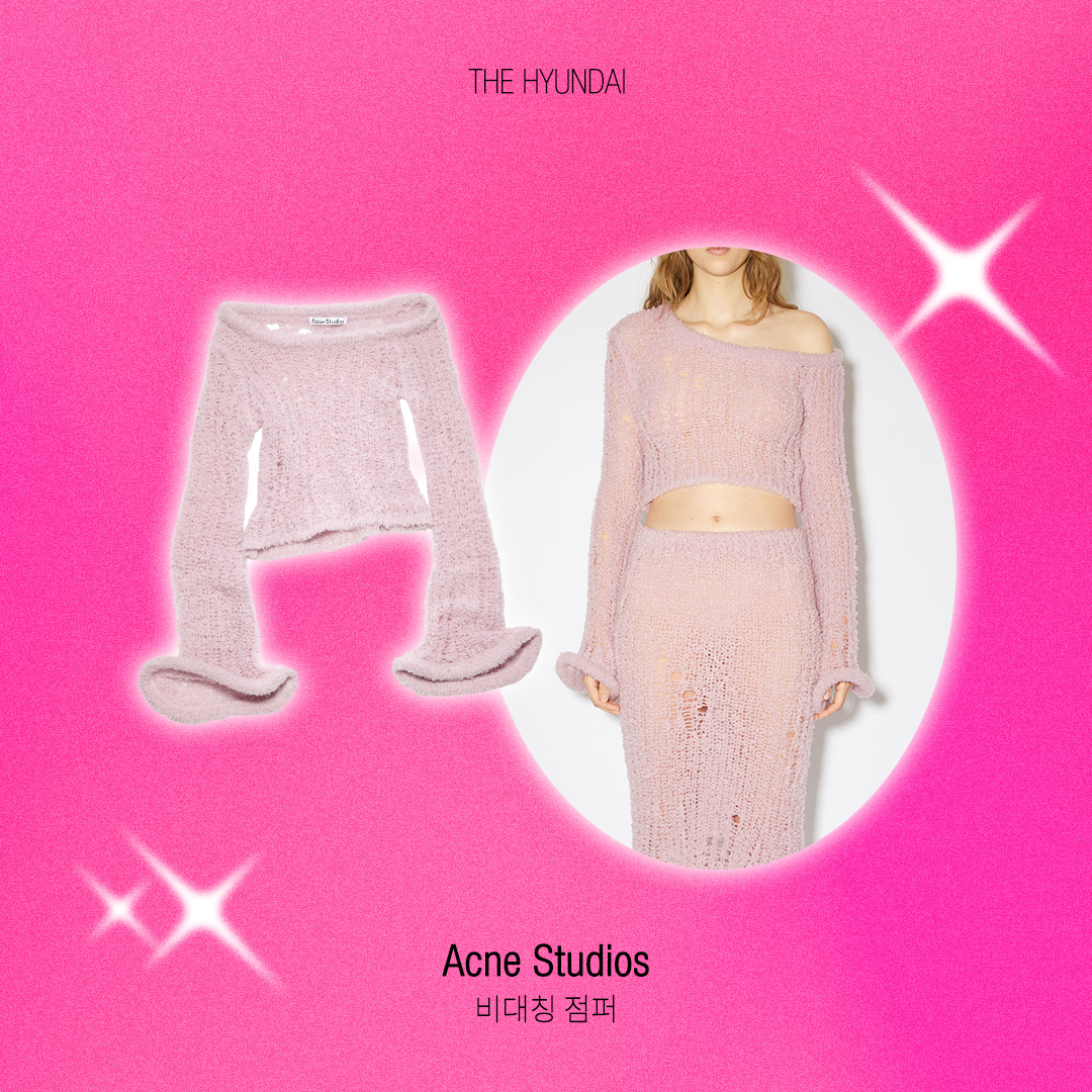여름에 입기 딱 좋을 정도로 가벼운 핑크 니트는 어떨까요. 편안하게 늘어나는 물결 모양의 넥라인과 커프스 라인이 돋보이는 아이템입니다. 허리 위까지 올라오는 크롭 길이가 경쾌한 이미지를 만들어주는데요. 비대칭 형태로 디자인된 넥라인 덕분에 여리여리하면서 관능적인 분위기도 느껴집니다. 서로 다른 소재의 슬리브리스를 이너로 레이어드 하기에도 좋을 것 같네요.